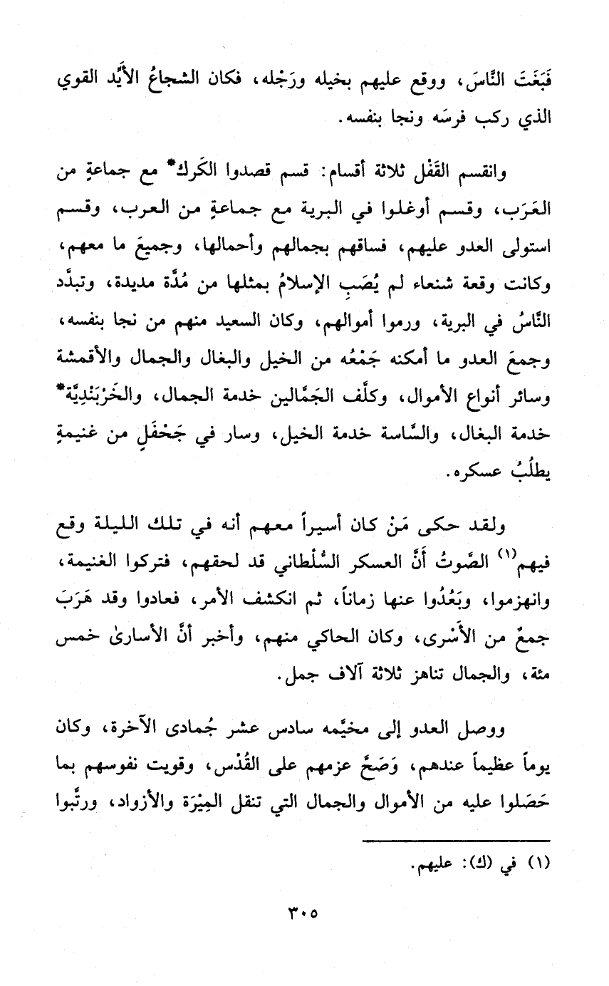 وانقسم القفل ثَلَاثَة أَقسَام قسم قصدُوا الكرك مَعَ جمَاعَة من الْعَرَب وَقسم أوغلوا فِي الْبَريَّة مَعَ جمَاعَة من الْعَرَب وَقسم استولى الْعَدو عَلَيْهِم فساقهم بجمالهم وأحمالهم وَجَمِيع مَا مَعَهم وَكَانَت وقْعَة شنعاء لم يصب الْإِسْلَام بِمِثْلِهَا من مُدَّة مديدة وتبدد النَّاس فِي الْبَريَّة ورموا أَمْوَالهم وَكَانَ السعيد مِنْهُم من نجا بِنَفسِهِ وَجمع الْعَدو مَا أمكنه جمعه من الْخَيل وَالْبِغَال وَالْجمال والأقمشة وَسَائِر أَنْوَاع الْأَمْوَال وكلف الجمالين خدمَة الْجمال والخربندية خدمَة البغال والساسة خدمَة الْخَيل وَسَار فِي جحفل من غنيمَة يطْلب عسكره
