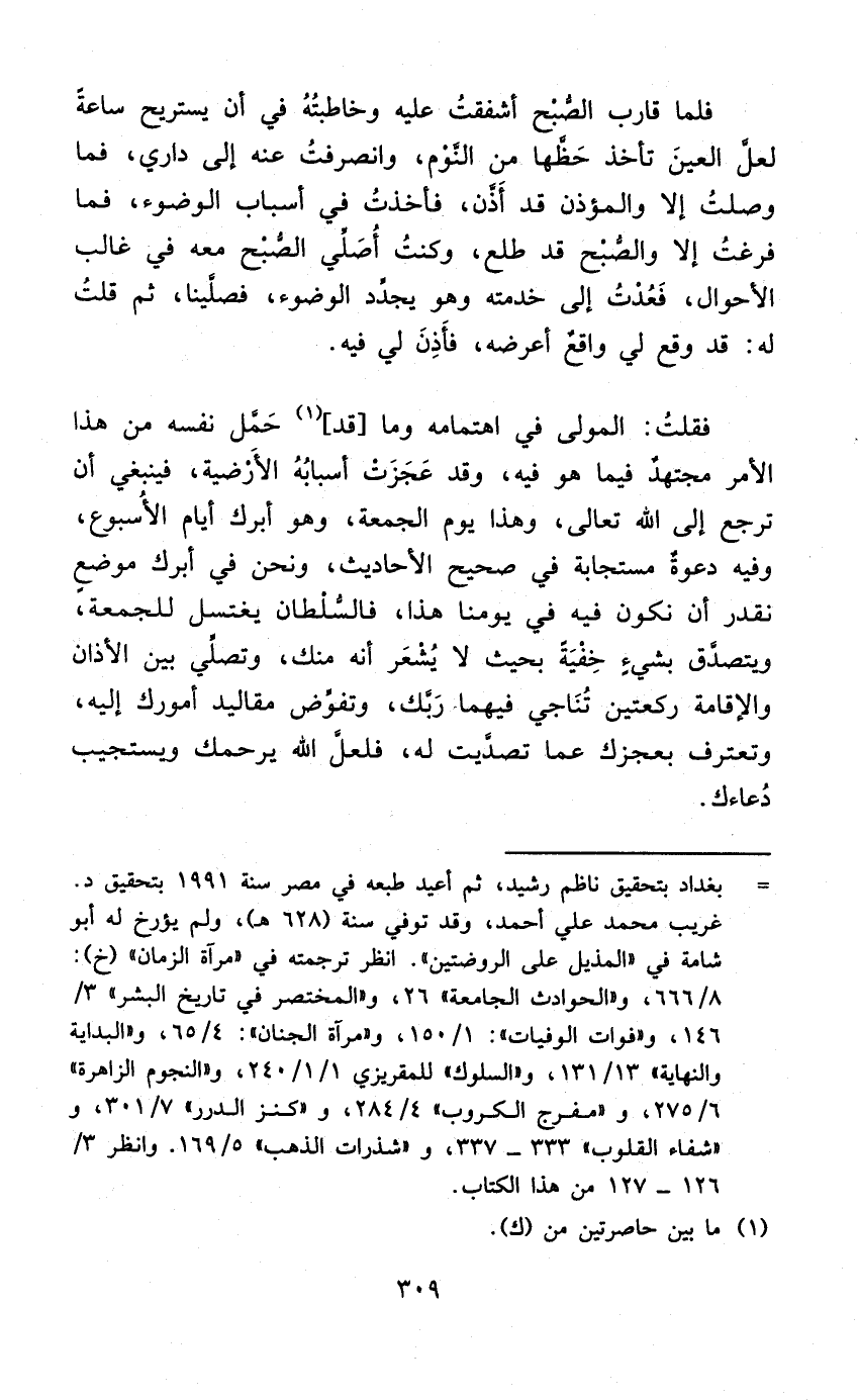 فَلَمَّا قَارب الصُّبْح أشفقت عَلَيْهِ وخاطبته فِي أَن يستريح سَاعَة لَعَلَّ الْعين تَأْخُذ حظها من النّوم وانصرفت عَنهُ إِلَى دَاري فَمَا وصلت إِلَّا والمؤذن قد أذن فَأخذت فِي أَسبَاب الْوضُوء فَمَا فرغت إِلَّا وَالصُّبْح قد طلع وَكنت أُصَلِّي الصُّبْح مَعَه فِي غَالب الْأَحْوَال فعدت إِلَى خدمته وَهُوَ يجدد الْوضُوء فصلينا ثمَّ قلت لَهُ قد وَقع لي وَاقع أعرضه فَأذن لي فِيهِ