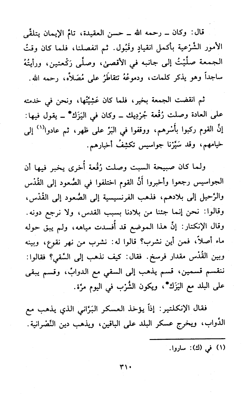 وَلما كَانَ صَبِيحَة السبت وصلت رقْعَة أُخْرَى يخبر فِيهَا أَن الجواسيس رجعُوا واخبروا أَن الْقَوْم اخْتلفُوا فِي الصعُود إِلَى الْقُدس والرحيل إِلَى بِلَادهمْ فَذهب الفرنسيسية إِلَى الصعُود إِلَى الْقُدس وَقَالُوا نَحن إِنَّمَا جِئْنَا من بِلَادنَا بِسَبَب الْقُدس وَلَا نرْجِع دونه وَقَالَ الانكتار إِن هَذَا الْموضع قد أفسدت مياهه وَلم يبْق حوله مَاء أصلا فَمن أَيْن نشرب قَالُوا لَهُ نشرب من نهر نقوع وَبَينه وَبَين الْقُدس مِقْدَار فَرسَخ فَقَالَ كَيفَ نَذْهَب إِلَى السَّقْي فَقَالُوا ننقسم قسمَيْنِ قسم يذهب إِلَى السَّقْي مَعَ الدَّوَابّ وَقسم يبْقى على الْبَلَد مَعَ اليزك وَيكون الشّرْب فِي الْيَوْم مرّة