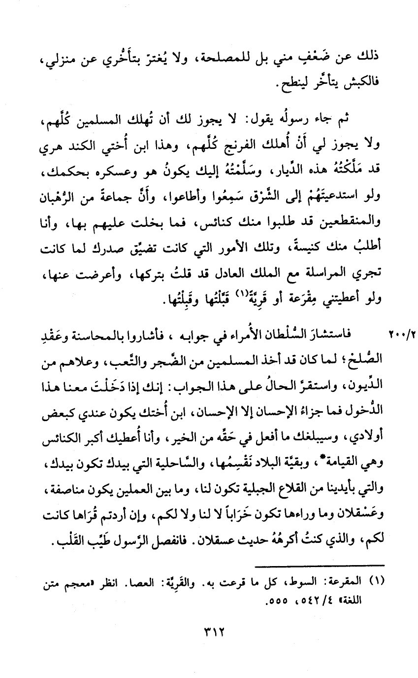 ثمَّ جَاءَ رَسُوله يَقُول لَا يجوز لَك أَن تهْلك الْمُسلمين كلهم وَلَا يجوز لي أَن أهلك الفرنج كلهم وَهَذَا ابْن أُخْتِي الكندهري قد ملكته هَذِه الديار وسلمته إِلَيْك يكون هُوَ وَعَسْكَره بحكمك وَلَو استدعيتهم إِلَى الشرق سمعُوا وأطاعوا وَأَن جمَاعَة من الرهبان والمنقطعين قد طلبُوا مِنْك كنائس فَمَا بخلت عَلَيْهِم بهَا وَأَنا أطلب مِنْك كَنِيسَة وَتلك الْأُمُور الَّتِي كَانَت تضيق صدرك لما كَانَت تجْرِي المراسلة مَعَ الْملك الْعَادِل قد قلت بِتَرْكِهَا وأعرضت عَنْهَا وَلَو أَعْطَيْتنِي مقرعة أَو قَرْيَة قبلتها وقبلتها