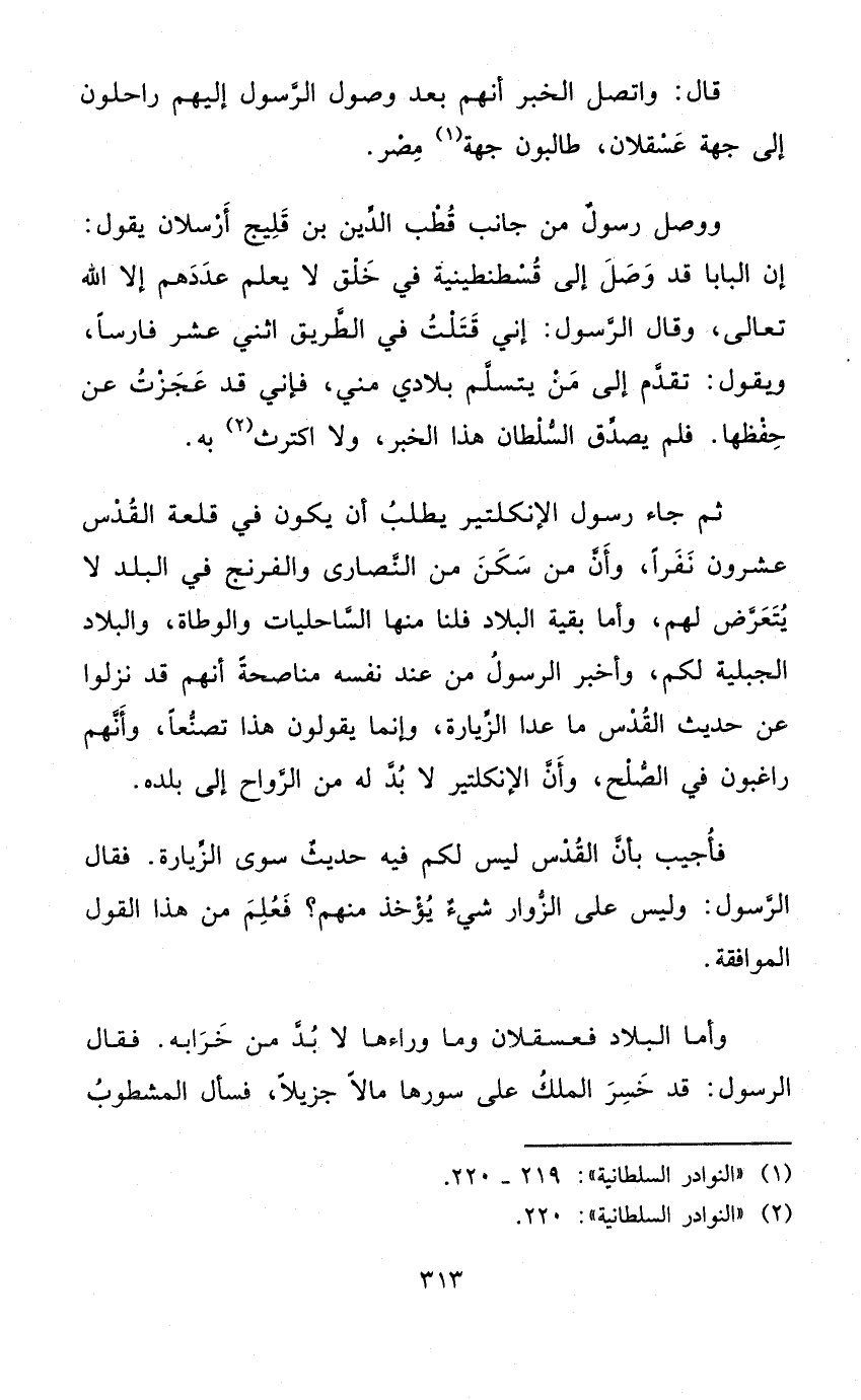 ثمَّ جَاءَ رسوا الإنكلتير يطْلب أَن يكون فِي قلعة الْقُدس عشرُون نَفرا وَأَن من سكن من النَّصَارَى والفرنج فِي الْبَلَد لَا يتَعَرَّض لَهُم وَأما بَقِيَّة الْبِلَاد فلنا مِنْهَا الساحليات والوطاة والبلاد الجبلية لكم وَأخْبر الرَّسُول من عِنْد نَفسه مناصحة أَنهم قد نزلُوا عَن حَدِيث الْقُدس مَا عدا الزِّيَارَة وَإِنَّمَا يَقُولُونَ هَذَا تصنعا وَأَنَّهُمْ راغبون فِي الصُّلْح وَأَن الإنكلتير لَا بُد لَهُ من الرواح إِلَى بَلَده