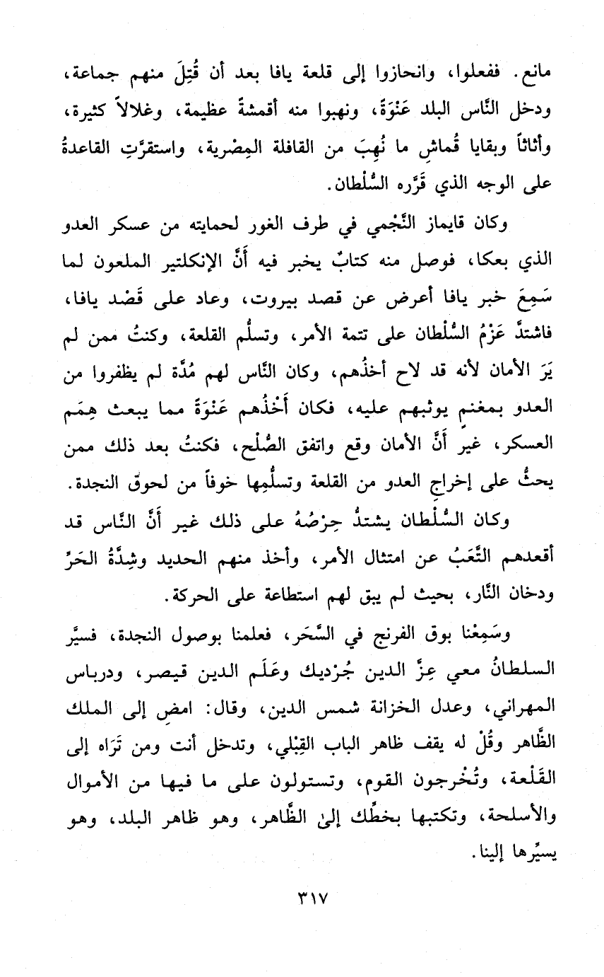 وَكَانَ قايماز النجمي فِي طرف الْغَوْر لحمايته من عَسْكَر الْعَدو الَّذِي بعكا فوصل مِنْهُ كتاب يخبر فِيهِ أَن الإنكلتير الملعون لما سمع خبر يافا أعرض عَن قصد بيروت وَعَاد على قصد يافا فَاشْتَدَّ عزم السُّلْطَان على تَتِمَّة الْأَمر وتسلم القلعة وَكنت مِمَّن لم ير الْأمان لانه قد لَاحَ أَخذهم وَكَانَ النَّاس لَهُم مُدَّة لم يظفروا من الْعَدو بمغنم يوثبهم عَلَيْهِ فَكَانَ أَخذهم عنْوَة مِمَّا يبْعَث همم الْعَسْكَر غير أَن الْأمان وَقع وَاتفقَ الصُّلْح فَكنت بعد ذَلِك مِمَّن يحث على إِخْرَاج الْعَدو من القلعة وتسلمها خوفًا من لُحُوق النجدة