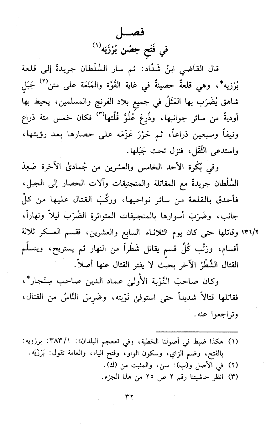 قَالَ القَاضِي ابْن شَدَّاد ثمَّ سَار السُّلْطَان جَرِيدَة إِلَى قلعة برزيه وَهِي قلعة حَصِينَة فِي غَايَة القوه والمنعة على متن جبل شَاهِق يضْرب بهَا الْمثل فِي جَمِيع بِلَاد الفرنج وَالْمُسْلِمين يُحِيط بهَا أَوديَة من سَائِر جوانبها وذرع علو قلتهَا فَكَانَ خمس مئة ذِرَاع ونيفا وَسبعين ذِرَاعا ثمَّ حرر عزمه على حصارها بعد رؤيتها واستدعى الثّقل فَنزل تَحت جبلها