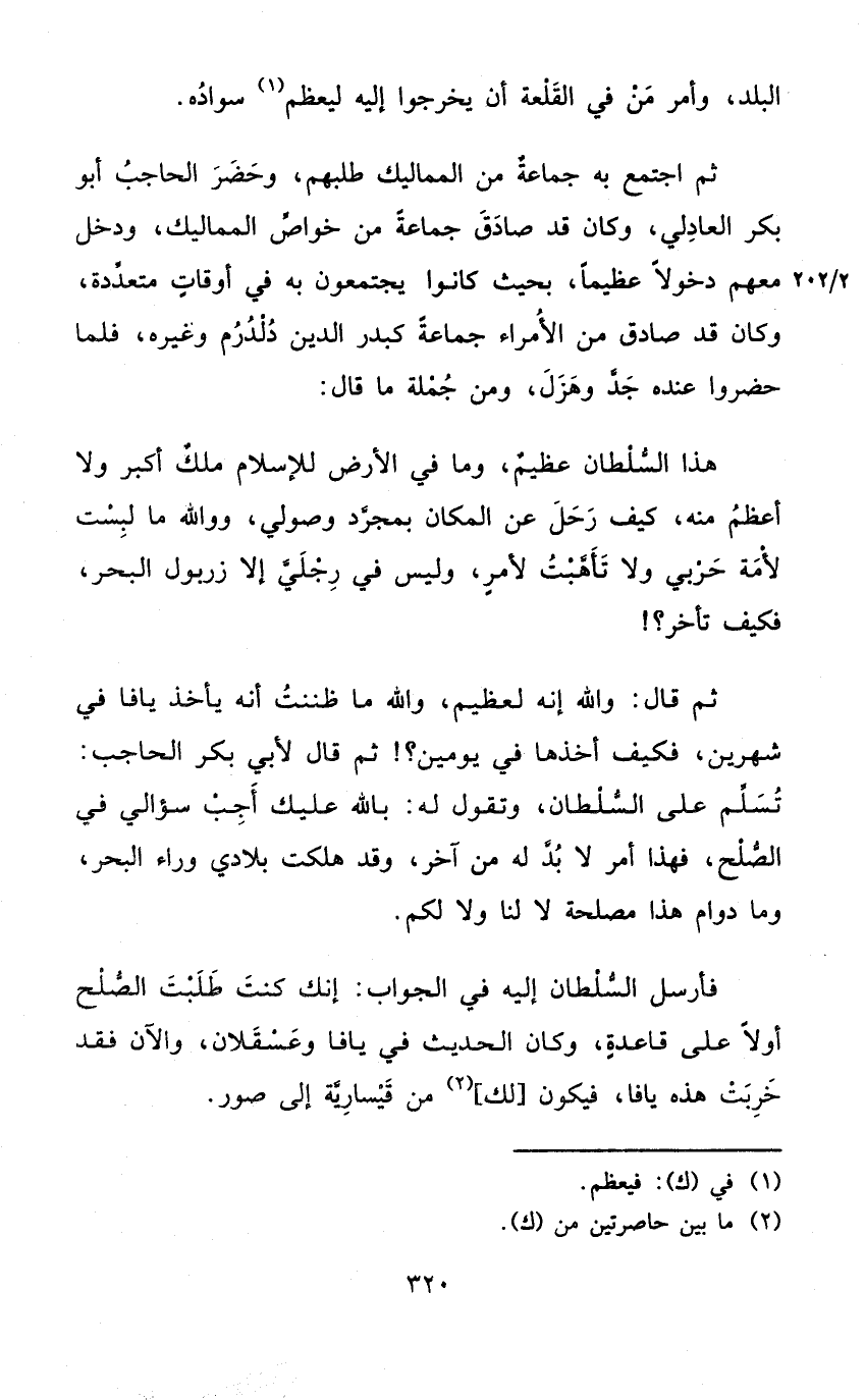 ثمَّ قَالَ وَالله إِنَّه لعَظيم وَالله مَا ظَنَنْت أَنه يَأْخُذ يافا فِي شَهْرَيْن فَكيف أَخذهَا فِي يَوْمَيْنِ ثمَّ قَالَ لأبي بكر الْحَاجِب تسلم على السُّلْطَان وَتقول لَهُ بِاللَّه عَلَيْك أجب سُؤَالِي فِي الصُّلْح فَهَذَا أَمر لَا بُد لَهُ من آخر وَقد هَلَكت بلادي وَرَاء الْبَحْر وَمَا دوَام هَذَا مصلحَة لَا لنا وَلَا لكم