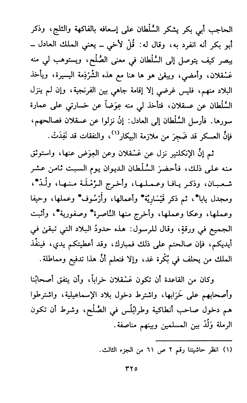 الْحَاجِب أبي بكر يشْكر السُّلْطَان على اسعافه بالفاكهة والثلج وَذكر أَبُو بكر أَنه انْفَرد بِهِ وَقَالَ لَهُ قل لأخي - يَعْنِي الْملك الْعَادِل - يبصر كَيفَ يتَوَصَّل إِلَى السُّلْطَان فِي معنى الصُّلْح ويستوهب لي مِنْهُ عسقلان وأمضي وَيبقى هُوَ هَا هُنَا مَعَ هَذِه الشرذمة الْيَسِيرَة وَيَأْخُذ الْبِلَاد مِنْهُم فَلَيْسَ غرضي إِلَّا إِقَامَة جاهي بَين الفرنجية وَإِن لم ينزل السُّلْطَان عَن عسقلان فتأخذ لي مِنْهُ عوضا عَن خسارتي على عمَارَة سورها فَأرْسل السُّلْطَان إِلَى الْعَادِل إِن نزلُوا عَن عسقلان فَصَالحهُمْ فَإِن الْعَسْكَر قد ضجر من مُلَازمَة البيكار والنفقات قد نفدت