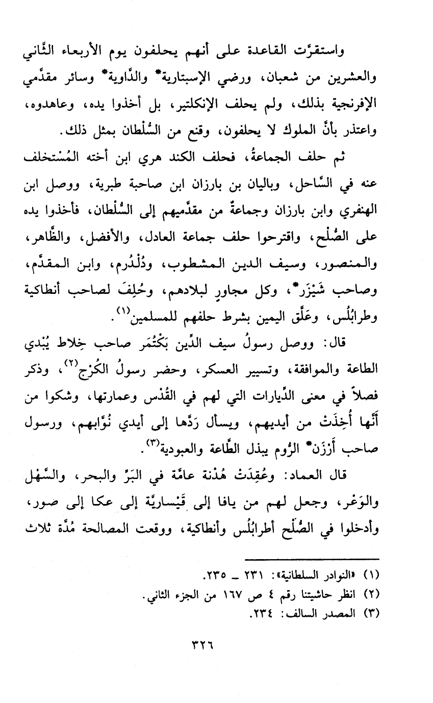 ثمَّ حلف الْجَمَاعَة فَحلف الكند هري ابْن أُخْته الْمُسْتَخْلف عَنهُ فِي السَّاحِل وباليان بن بارزان ابْن صَاحِبَة طبرية وَوصل ابْن الهنفري وَابْن بارزان وَجَمَاعَة من مقدميهم إِلَى السُّلْطَان فَأخذُوا يَده على الصُّلْح واقترحوا حلف جمَاعَة الْعَادِل وَالْأَفْضَل وَالظَّاهِر والمنصور وَسيف الدّين المشطوب ودلدرم وَابْن الْمُقدم وَصَاحب شيزر وكل مجاور لبلادهم وَحلف لصَاحب أنطاكية وطرابلس وعلق الْيَمين بِشَرْط حلفهم للْمُسلمين