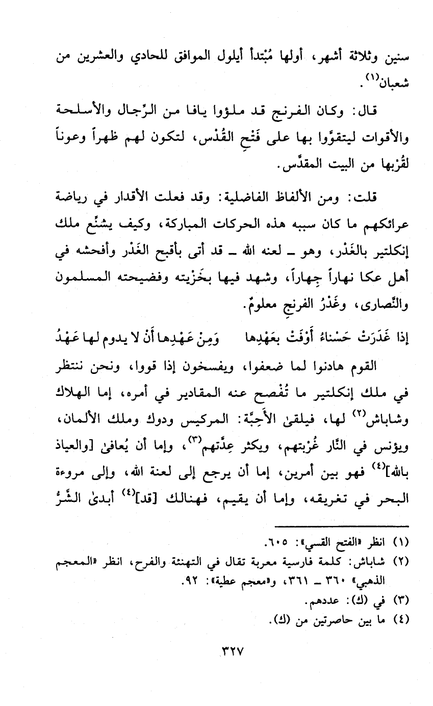 قلت وَمن الْأَلْفَاظ الْفَاضِلِيَّةِ وَقد فعلت الأقدار فِي رياضة عرائكهم مَا كَانَ سَببه هَذِه الحركات الْمُبَارَكَة وَكَيف يشنع ملك إنكلتير بالغدر وَهُوَ - لَعنه الله - قد أَتَى بأقبح الْغدر وأفحشه فِي أهل عكا نَهَارا جهارا وَشهد فِيهَا بخزيته وفضيحته الْمُسلمُونَ وَالنَّصَارَى وغدر الفرنج مَعْلُوم