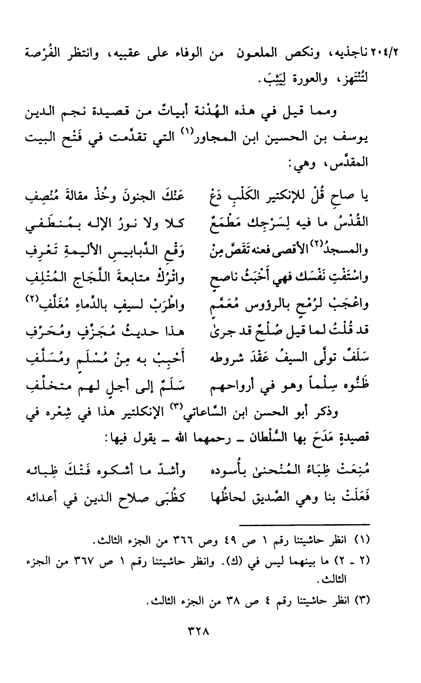 وَمِمَّا قيل فِي هَذِه الْهُدْنَة أَبْيَات من قصيدة نجم الدّين يُوسُف بن الْحُسَيْن ابْن المجاور الَّتِي تقدّمت فِي فتح الْبَيْت الْمُقَدّس وَهِي