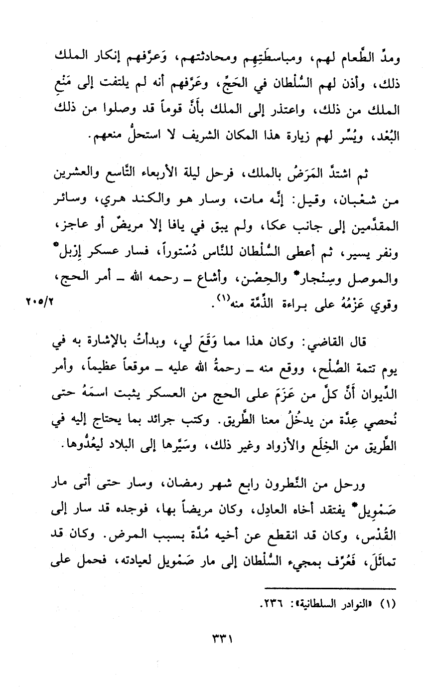 ورحل من النطرون رَابِع شهر رَمَضَان وَسَار حَتَّى أَتَى مار صمويل يفتقد أَخَاهُ الْعَادِل وَكَانَ مَرِيضا بهَا فَوَجَدَهُ قد سَار إِلَى الْقُدس وَكَانَ قد انْقَطع عَن أَخِيه مُدَّة بِسَبَب الْمَرَض وَكَانَ قد تماثل فَعرف بمجيء السُّلْطَان إِلَى مار صمويل لعيادته فَحمل على