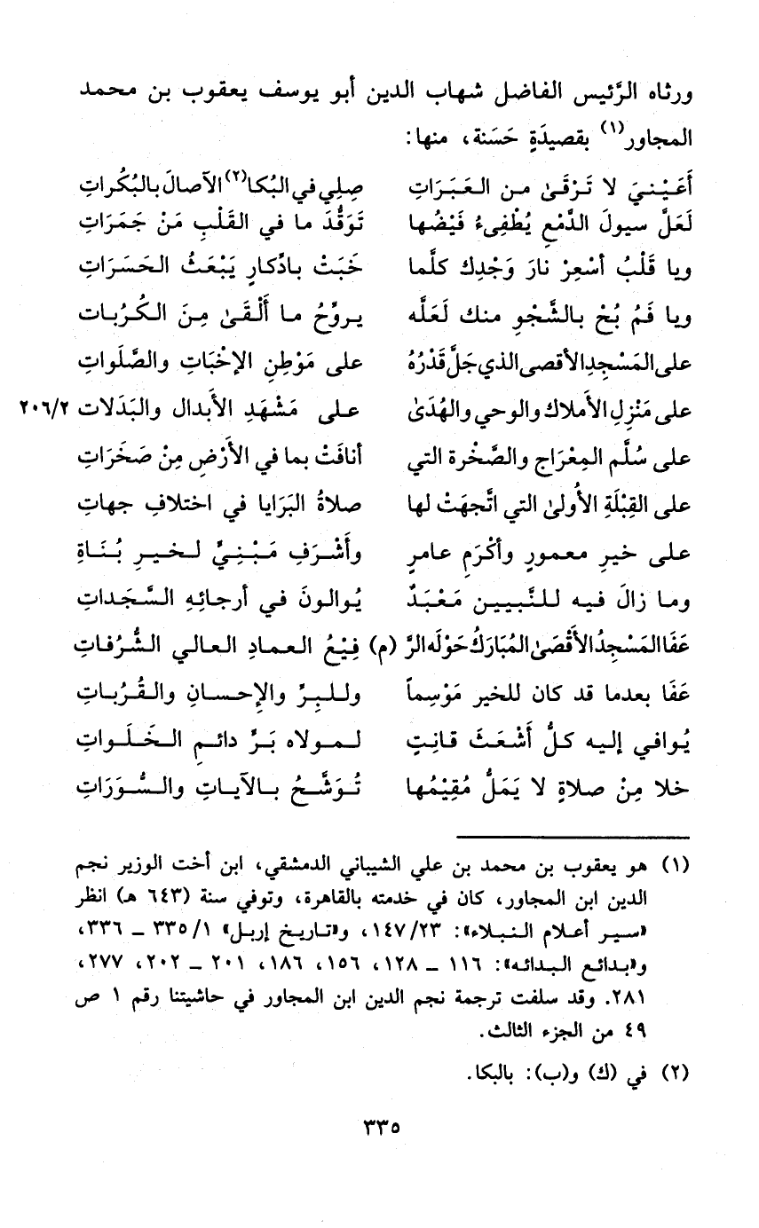 (عَفا الْمَسْجِد الْأَقْصَى الْمُبَارك حوله الرفيع ... الْعِمَاد العالي الشرفات)