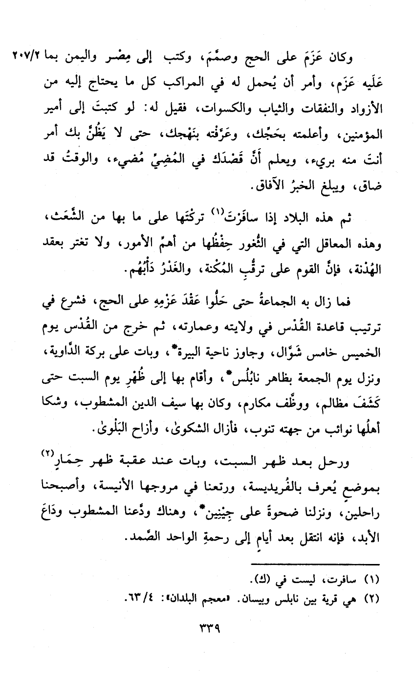 فَمَا زَالَ بِهِ الْجَمَاعَة حَتَّى حلوا عقد عزمه على الْحَج فشرع فِي تَرْتِيب قَاعِدَة الْقُدس فِي ولَايَته وعمارته ثمَّ خرج من الْقُدس يَوْم الْخَمِيس خَامِس شَوَّال وَجَاوَزَ نَاحيَة البيرة وَبَات على بركَة الداوية وَنزل يَوْم الْجُمُعَة بِظَاهِر نابلس وَأقَام بهَا إِلَى ظهر يَوْم السبت حَتَّى كشف مظالم ووظف مَكَارِم وَكَانَ بهَا سيف الدّين المشطوب وشكا أَهلهَا نَوَائِب من جِهَته تنوب فأزال الشكوى وأزاح الْبلوى