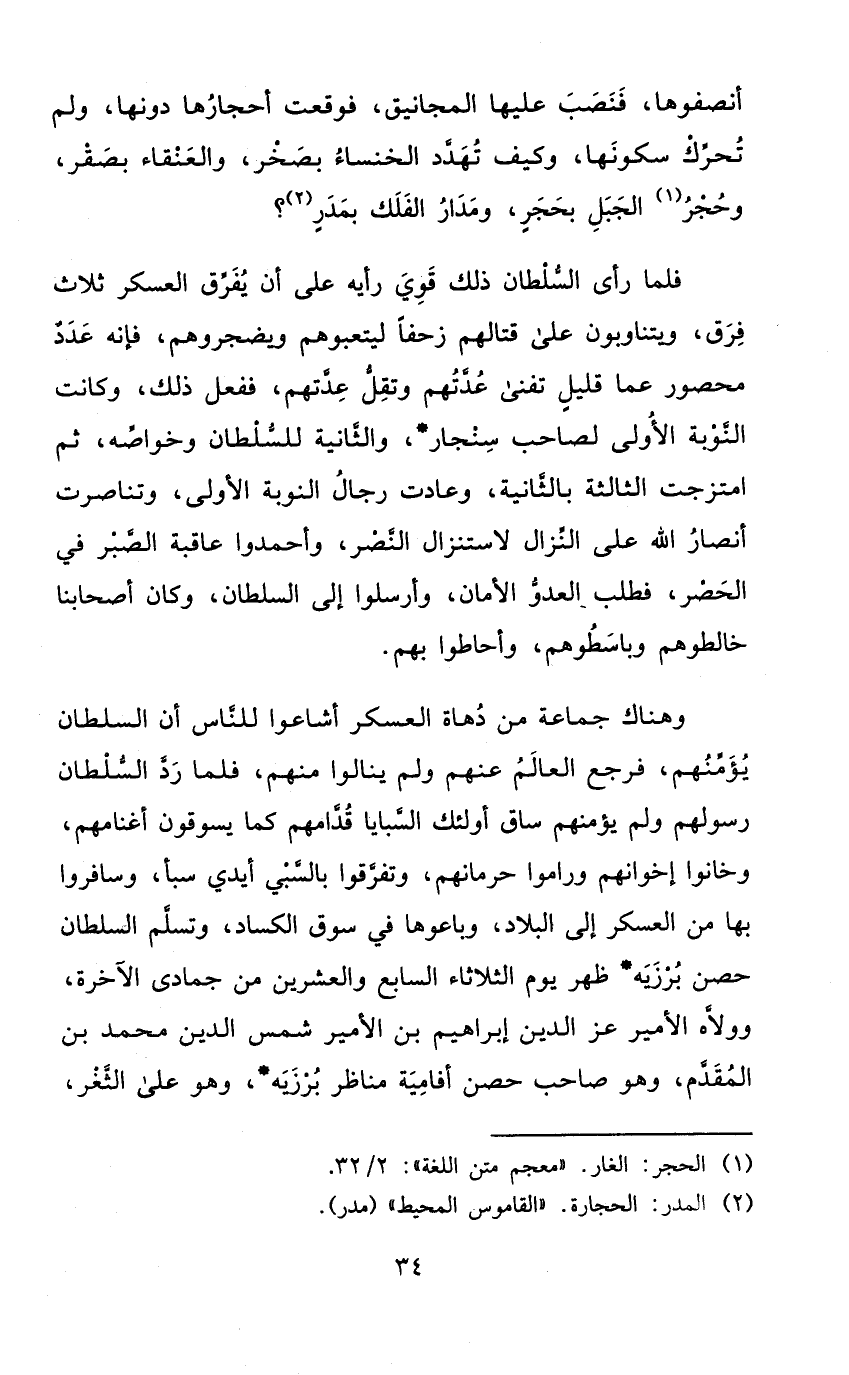 فَلَمَّا رأى السُّلْطَان ذَلِك قوي رَأْيه على أَن يفرق الْعَسْكَر ثَلَاث فرق ويتناوبون على قِتَالهمْ زحفا ليتعبوهم ويضجروهم فَإِنَّهُ عدد مَحْصُور عَمَّا قَلِيل تفنى عدتهمْ وتقل عدتهمْ فَفعل ذَلِك وَكَانَت النّوبَة الأولى لصَاحب سنجار وَالثَّانيَِة للسُّلْطَان وخواصه ثمَّ امتزجت الثالثه بِالثَّانِيَةِ وعادت رجال النّوبَة الأولى وتناصرت أنصار الله على النزال لاستنزال النَّصْر وأحمدوا عَاقِبَة الصَّبْر فِي الْحصْر فَطلب الْعَدو الْأمان وَأَرْسلُوا إِلَى السُّلْطَان وَكَانَ أَصْحَابنَا خالطوهم وباسطوهم وَأَحَاطُوا بهم