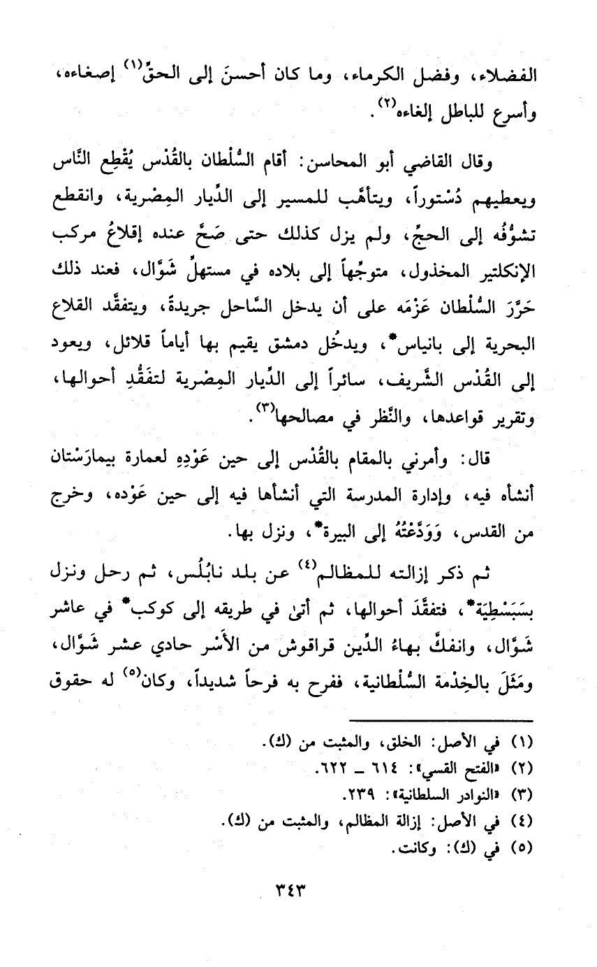 ثمَّ ذكر إِزَالَته للمظالم عَن بلد نابلس ثمَّ رَحل وَنزل بسبسطية فتفقد أحوالها ثمَّ أَتَى فِي طَرِيقه إِلَى كَوْكَب فِي عَاشر شَوَّال وانفك بهاء الدّين قراقوش من الْأسر حادي عشر شَوَّال وَمثل بِالْخدمَةِ السُّلْطَانِيَّة ففرح بِهِ فَرحا شَدِيدا وَكَانَ لَهُ حُقُوق