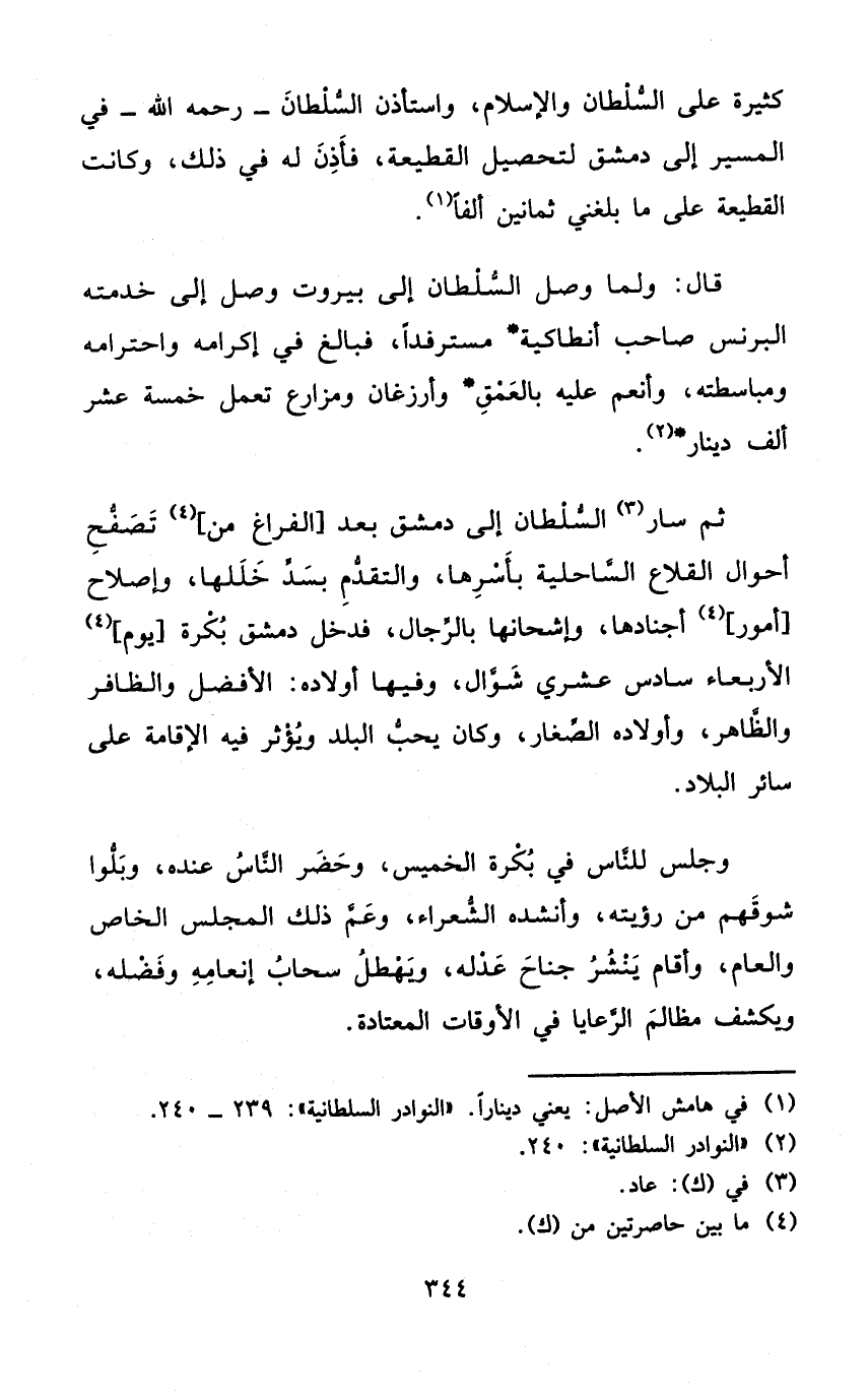 كَثِيرَة على السُّلْطَان وَالْإِسْلَام وَاسْتَأْذَنَ السُّلْطَان - رَحمَه الله - فِي الْمسير إِلَى دمشق لتَحْصِيل القطيعة فَأذن لَهُ فِي ذَلِك وَكَانَت القطيعة على مَا بَلغنِي ثَمَانِينَ ألفا