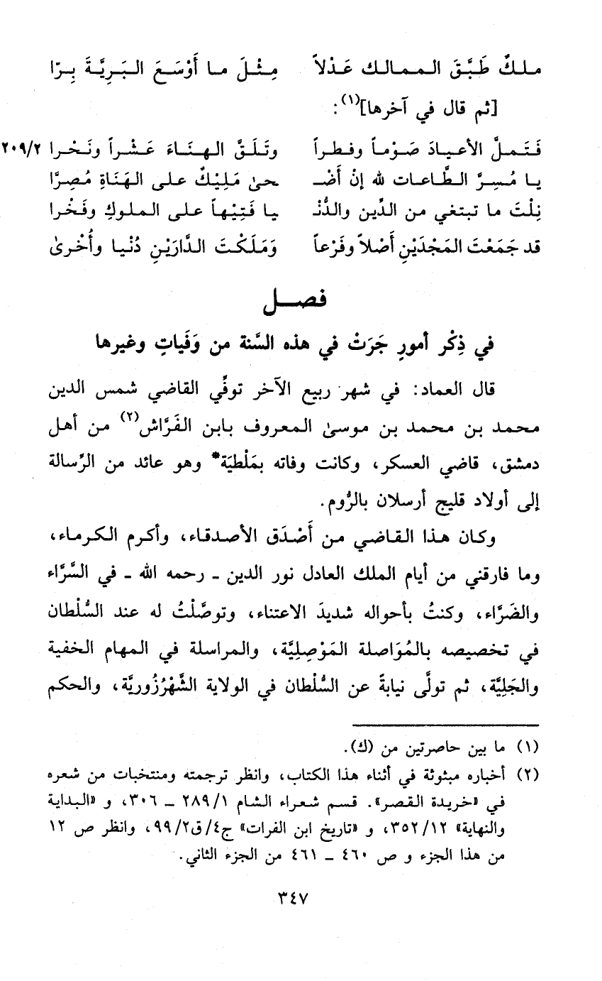 قَالَ الْعِمَاد فِي شهر ربيع الآخر توفّي القَاضِي شمس الدّين مُحَمَّد بن مُحَمَّد بن مُوسَى الْمَعْرُوف بِابْن الْفراش من أهل دمشق قَاضِي الْعَسْكَر وَكَانَت وَفَاته بملطية وَهُوَ عَائِد من الرسَالَة إِلَى أَوْلَاد قليج أرسلان بالروم