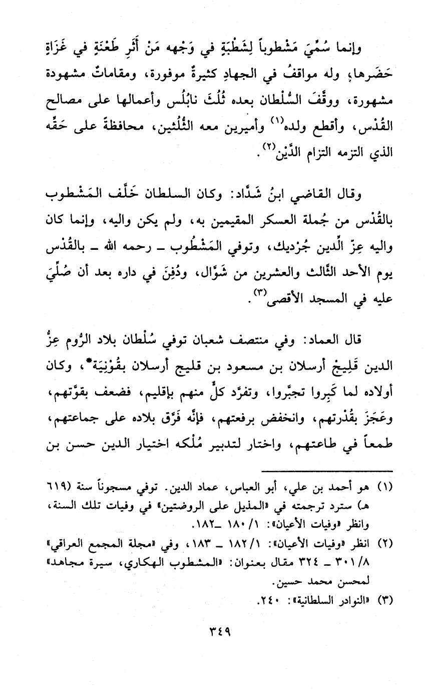 وَإِنَّمَا سمي مشطوبا لشطبة فِي وَجهه من أثر طعنة فِي غزَاة حضرها وَله مَوَاقِف فِي الْجِهَاد كَثِيرَة موفورة ومقامات مَشْهُودَة مَشْهُورَة ووقف السُّلْطَان بعده ثلث نابلس وأعمالها على مصَالح الْقُدس وأقطع وَلَده وأميرين مَعَه الثُّلثَيْنِ مُحَافظَة على حَقه الَّذِي الْتَزمهُ الْتِزَام الدّين