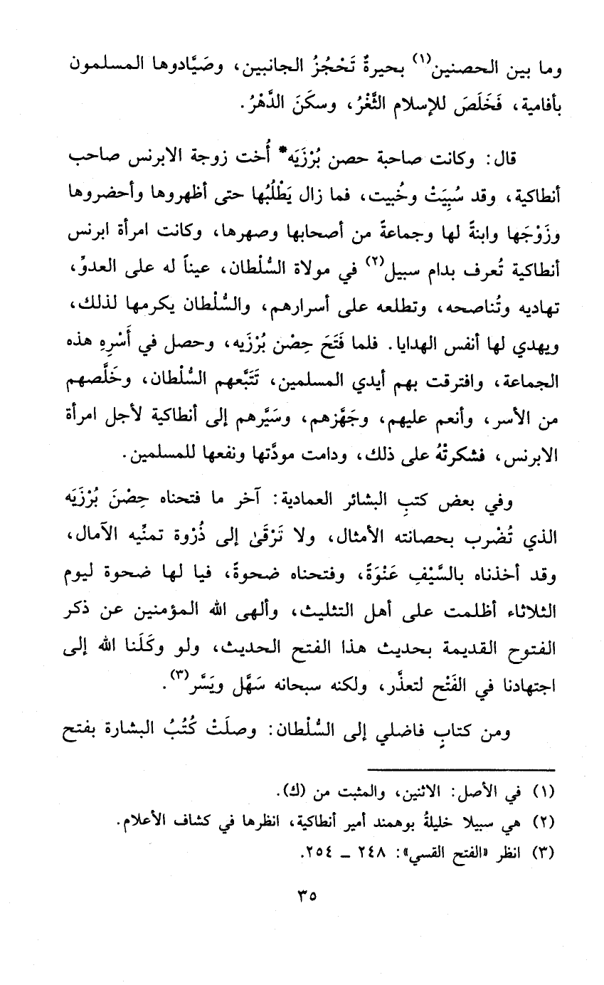 قَالَ وَكَانَت صَاحِبَة حصن برزيه أُخْت زَوْجَة الابرنس صَاحب أنطاكية وَقد سبيت وخبيت فَمَا زَالَ يطْلبهَا حَتَّى اظهروها وأحضروها وَزوجهَا وَابْنَة لَهَا وَجَمَاعَة من أَصْحَابهَا وصهرها وَكَانَت أمْرَأَة ابرنس أنطاكية تعرف بدام سَبِيل فِي مولاة السُّلْطَان عينا لَهُ على الْعَدو تهاديه وتناصحه وتطلعه على أسرارهم وَالسُّلْطَان يكرمها لذَلِك وَيهْدِي لَهَا أنفس الْهَدَايَا فَلَمَّا فتح حصن برزيه وَحصل فِي أسره هَذِه الْجَمَاعَة وافترقت بهم أَيدي الْمُسلمين تتبعهم السُّلْطَان وخلصهم من الْأسر وأنعم عَلَيْهِم وجهزهم وسيرهم إِلَى أنطاكية لأجل امْرَأَة الابرنس فشكرته على ذَلِك ودامت مودتها ونفعها للْمُسلمين