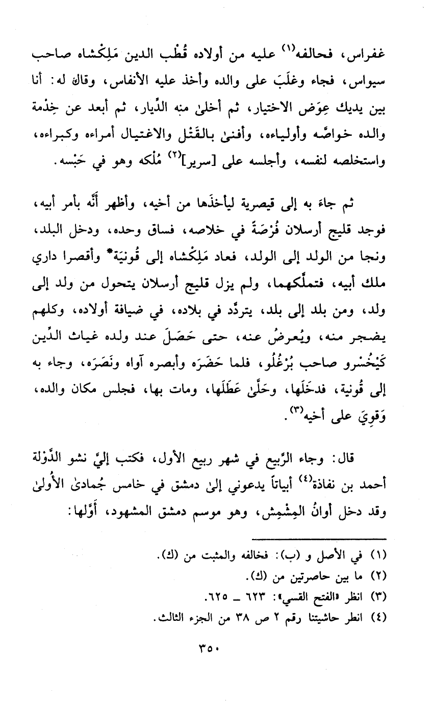 ثمَّ جَاءَ بِهِ إِلَى قيصرية ليأخذها من أَخِيه وَأظْهر أَنه بِأَمْر أَبِيه فَوجدَ قليج أرسلان فرْصَة فِي خلاصه فساق وَحده وَدخل الْبَلَد وَنَجَا من الْوَلَد إِلَى الْوَلَد فَعَاد ملكشاه إِلَى قونية وأقصرا دَاري ملك أَبِيه فتملكهما وَلم يزل قليج أرسلان يتَحَوَّل من ولد إِلَى ولد وَمن بلد إِلَى بلد يتَرَدَّد فِي بِلَاده فِي ضِيَافَة أَوْلَاده وَكلهمْ يضجر مِنْهُ ويعرض عَنهُ حَتَّى حصل عِنْد وَلَده غياث الدّين كيخسرو صَاحب برغلو فَلَمَّا حَضَره وأبصره آواه وَنَصره وَجَاء بِهِ إِلَى قونية فَدَخلَهَا وحلى عطلها وَمَات بهَا فَجَلَسَ مَكَان وَالِده وَقَوي على أَخِيه