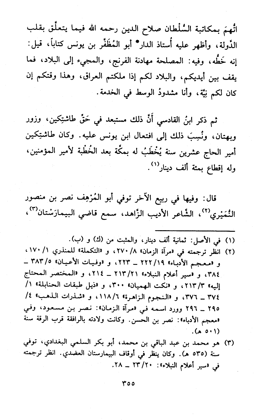 ثمَّ ذكر ابْن القادسي أَن ذَلِك مستبعد فِي حق طاشتكين وزور وبهتان وَنسب ذَلِك إِلَى افتعال ابْن يُونُس عَلَيْهِ وَكَانَ طاشتكين أَمِير الْحَاج عشْرين سنة يخْطب لَهُ بِمَكَّة بعد الْخطْبَة لأمير الْمُؤمنِينَ وَله إقطاع بمئة ألف دِينَار