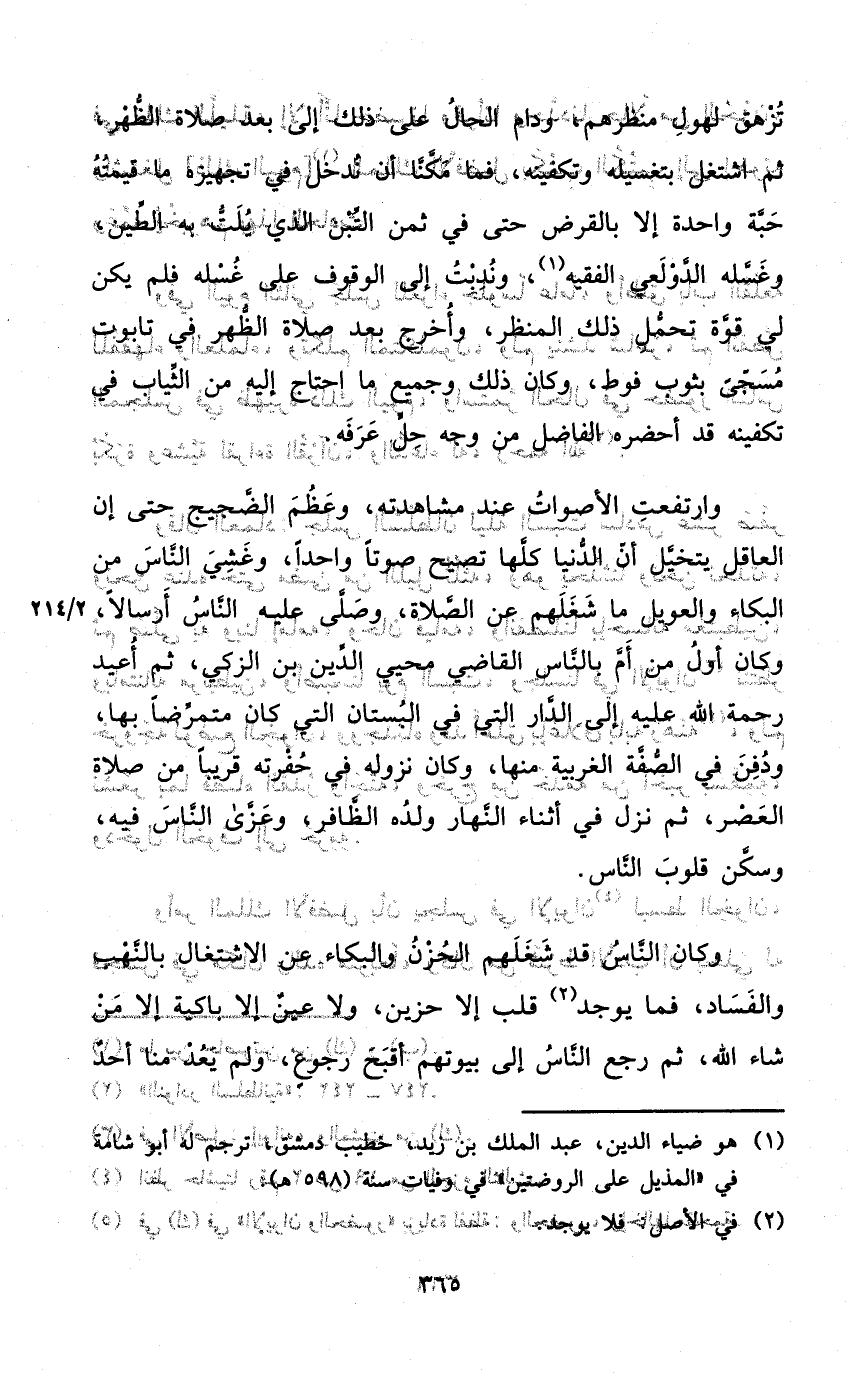 تزهق لهول منظرهم ودام الْحَال على ذَلِك إِلَى بعد صَلَاة الظّهْر ثمَّ اشْتغل بتغسيله وتكفينه فَمَا مكنا أَن ندخل فِي تَجْهِيزه مَا قِيمَته حَبَّة وَاحِدَة إِلَّا بالقرض حَتَّى فِي ثمن التِّبْن الَّذِي يلت بِهِ الطين وغسله الدولعي الْفَقِيه وندبت إِلَى الْوُقُوف على غسله فَلم يكن لي قُوَّة تحمل ذَلِك المنظروأخرج بعد صَلَاة الظّهْر فِي تَابُوت مسجى بِثَوْب فوط وَكَانَ ذَلِك وَجَمِيع مَا احْتَاجَ إِلَيْهِ من الثِّيَاب فِي تكفينه قد أحضرهُ الْفَاضِل من وَجه حل عرفه