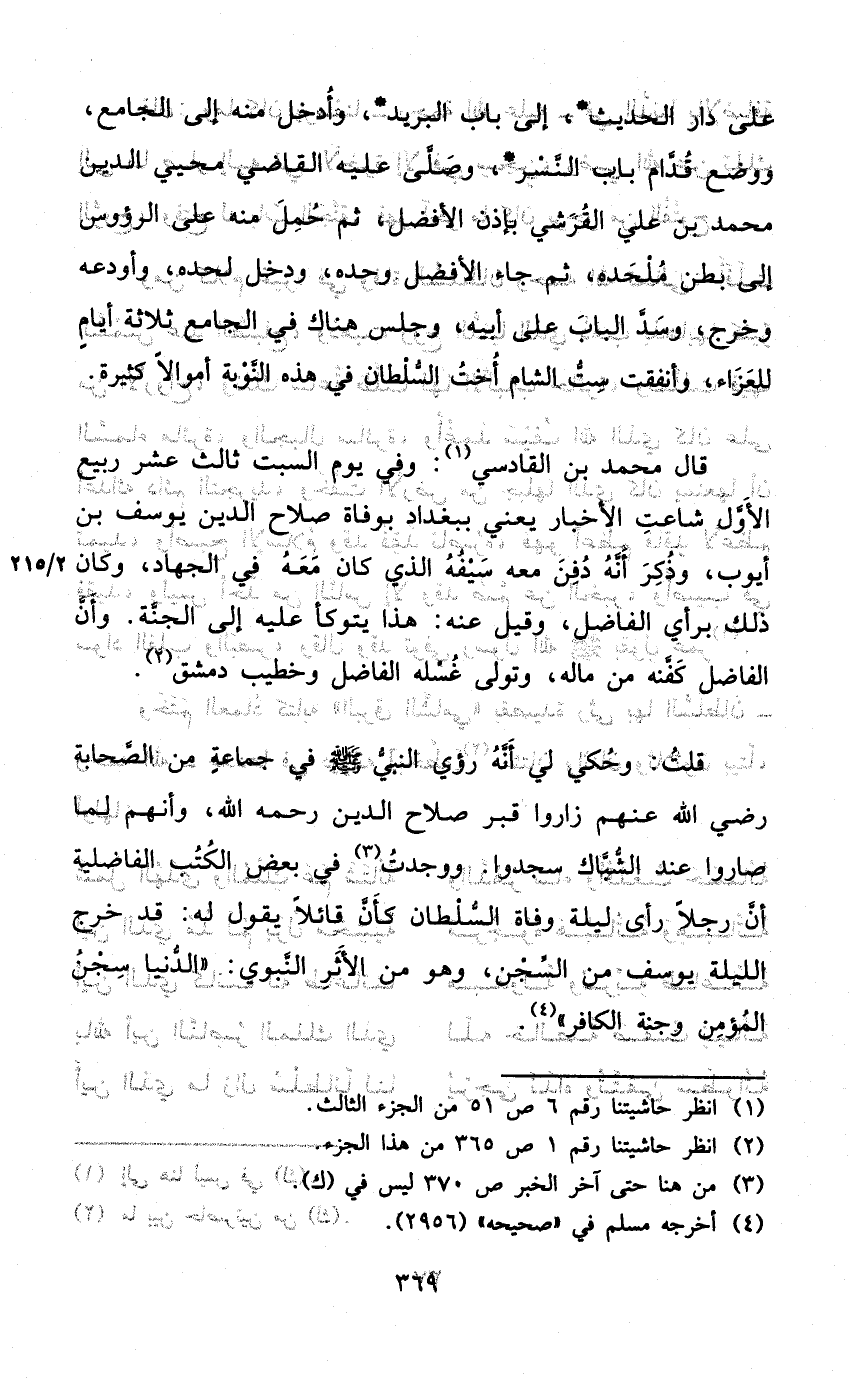 قلت وَحكي لي أَنه رُؤِيَ النَّبِي صلى الله عَلَيْهِ وَسلم فِي جمَاعَة من الصَّحَابَة رَضِي الله عَنْهُم زاروا قبر صَلَاح الدّين رَحمَه الله وَأَنَّهُمْ لما صَارُوا عِنْد الشباك سجدوا وَوجدت فِي بعض الْكتب الْفَاضِلِيَّةِ أَن رجلا رأى لَيْلَة وَفَاة السُّلْطَان كَأَن قَائِلا يَقُول لَهُ قد خرج اللَّيْلَة يُوسُف من السجْن وَهُوَ من الْأَثر النَّبَوِيّ الدُّنْيَا سجن الْمُؤمن وجنة الْكَافِر