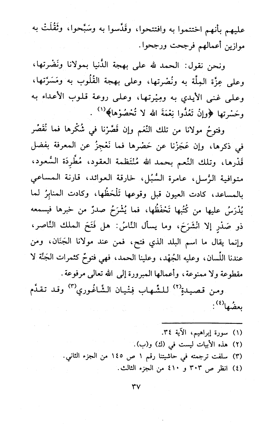 وَنحن نقُول الْحَمد لله على بهجة الدُّنْيَا بمولانا ونضرتها وعَلى عزة الْملَّة بِهِ ونضرتها وعَلى بهجة الْقُلُوب بِهِ ومسرتها وعَلى غنى الْأَيْدِي بِهِ وميرتها وعَلى روعة قُلُوب الْأَعْدَاء بِهِ وحسرتها {وَإِن تعدوا نعْمَة الله لَا تحصوها}