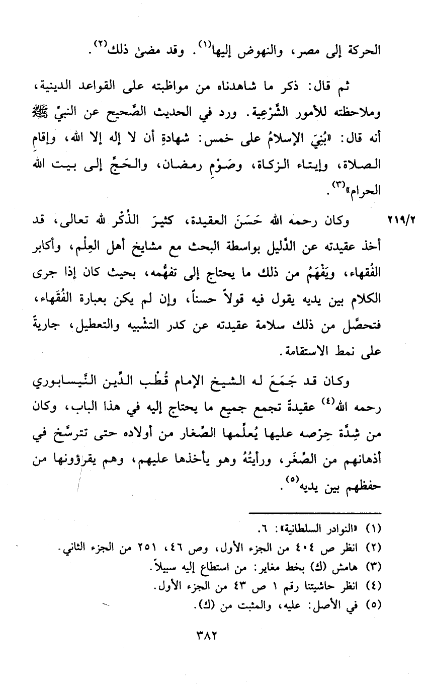 ثمَّ قَالَ ذكر مَا شَاهَدْنَاهُ من مواظبته على الْقَوَاعِد الدِّينِيَّة وملاحظته للأمور الشَّرْعِيَّة ورد فِي الحَدِيث الصَّحِيح عَن النَّبِي صلى الله عَلَيْهِ وَسلم أَنه قَالَ بني الْإِسْلَام على خمس شَهَادَة أَن لَا إِلَه إِلَّا الله وإقام الصَّلَاة وإيتاء الزَّكَاة وَصَوْم رَمَضَان وَالْحج إِلَى بَيت الله الْحَرَام