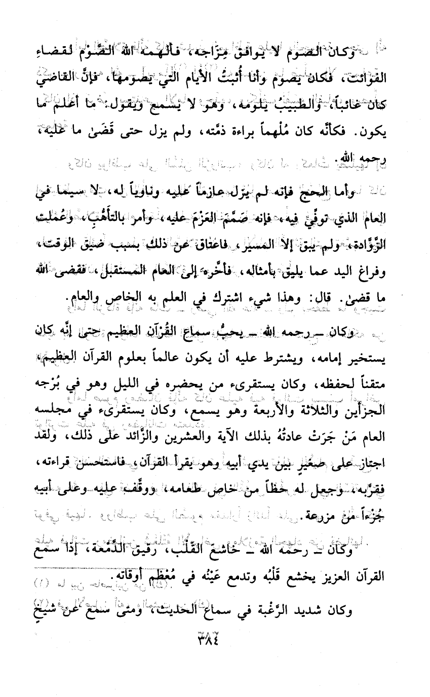 وَكَانَ الصَّوْم لَا يُوَافق مزاجه فألهمه الله الصَّوْم لقَضَاء الْفَوَائِت فَكَانَ يَصُوم وَأَنا أثبت الْأَيَّام الَّتِي يصومها فَإِن القَاضِي كَانَ غَائِبا والطبيب يلومه وَهُوَ لَا يسمع وَيَقُول مَا أعلم مَا يكون فَكَأَنَّهُ كَانَ ملهما بَرَاءَة ذمَّته وَلم يزل حَتَّى قضى مَا عَلَيْهِ رَحمَه الله