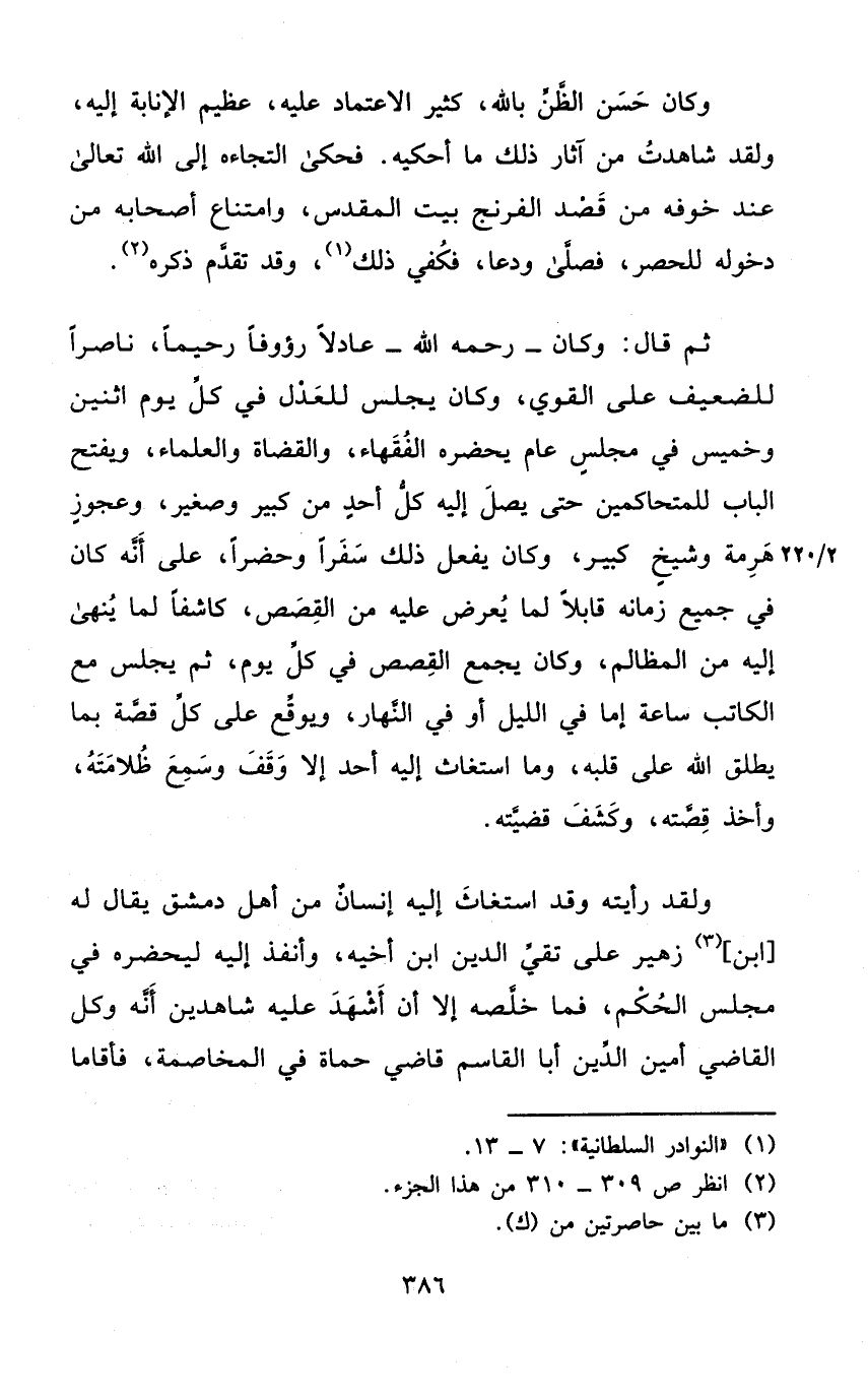 وَكَانَ حسن الظَّن بِاللَّه كثير الِاعْتِمَاد عَلَيْهِ عَظِيم الانابة إِلَيْهِ وَلَقَد شاهدت من آثَار ذَلِك مَا أحكيه فَحكى التجاءه إِلَى الله تَعَالَى عِنْد خَوفه من قصد الفرنج بَيت الْمُقَدّس وَامْتِنَاع أَصْحَابه من دُخُوله للحصر فصلى ودعا فكفي ذَلِك وَقد تقدم ذكره