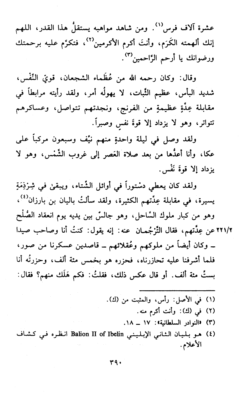 وَلَقَد كَانَ يُعْطي دستورا فِي أَوَائِل الشتَاء وَيبقى فِي شرذمة يسيرَة فِي مُقَابلَة عدتهمْ الْكَثِيرَة وَلَقَد سَأَلت باليان بن بارزان وَهُوَ من كبار مُلُوك السَّاحِل وَهُوَ جَالس بَين يَدَيْهِ يَوْم انْعِقَاد الصُّلْح عَن عدتهمْ فَقَالَ الترجمان عَنهُ إِنَّه يَقُول كنت أَنا وَصَاحب صيدا وَكَانَ أَيْضا من مُلُوكهمْ وعقلائهم قَاصِدين عسكرنا من صور فَلَمَّا أَشْرَفنَا عَلَيْهِ تحازرناه فحزره هُوَ بِخمْس مئة ألف وحزرته أَنا بست مئة ألف أَو قَالَ عكس ذَلِك فَقلت فكم هلك مِنْهُم فَقَالَ