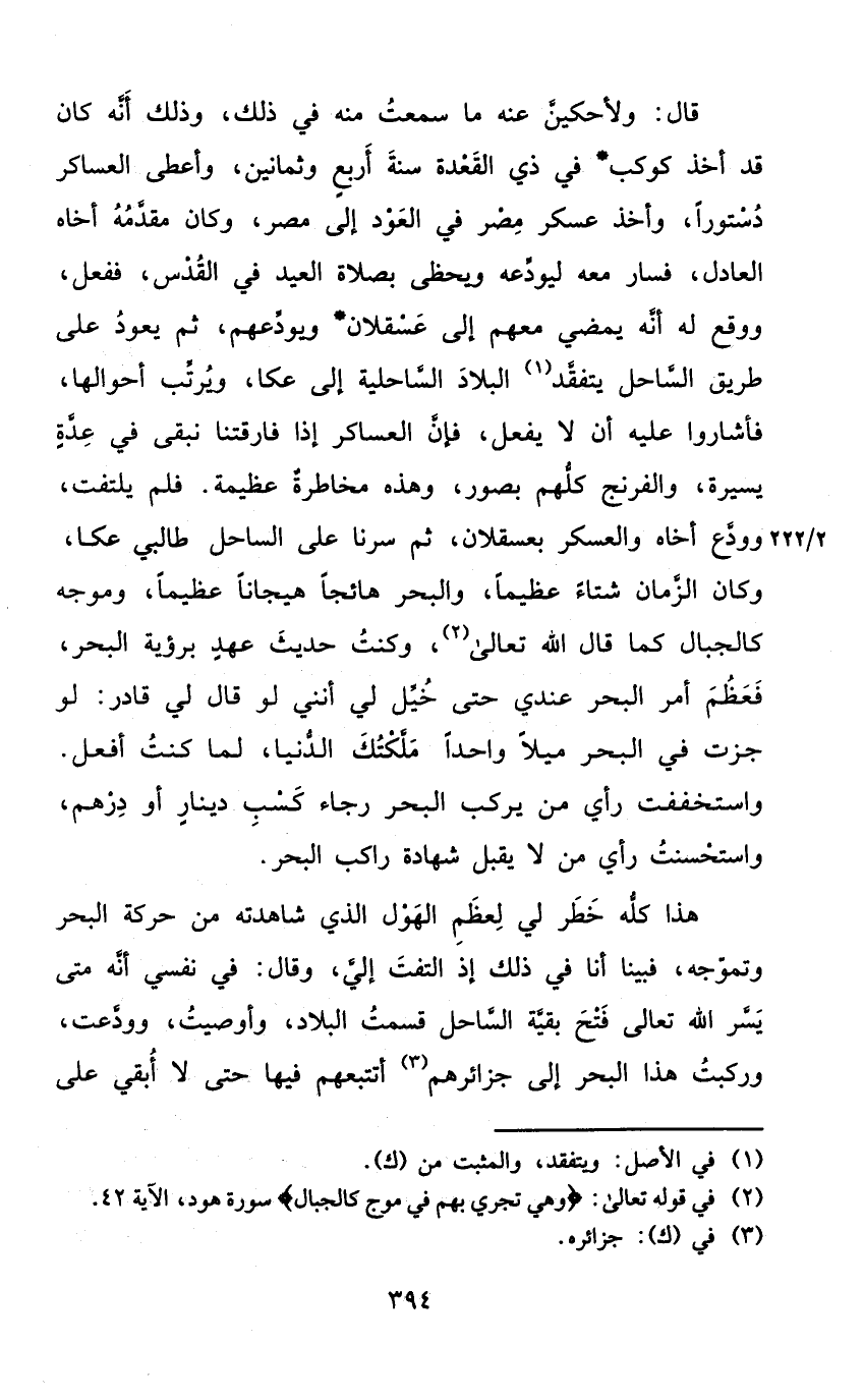 قَالَ ولأحكين عَنهُ مَا سَمِعت مِنْهُ فِي ذَلِك وَذَلِكَ أَنه كَانَ قد أَخذ كَوْكَب فِي ذِي الْقعدَة سنة أَربع وَثَمَانِينَ وَأعْطى العساكر دستورا وَأخذ عَسْكَر مصر فِي الْعود إِلَى مصر وَكَانَ مقدمه أَخَاهُ الْعَادِل فَسَار مَعَه ليودعه ويحظى بِصَلَاة الْعِيد فِي الْقُدس فَفعل وَوَقع لَهُ أَنه يمْضِي مَعَهم إِلَى عسقلان ويودعهم ثمَّ يعود على طَرِيق السَّاحِل يتفقد الْبِلَاد الساحلية إِلَى عكا ويرتب أحوالها فأشاروا عَلَيْهِ أَن لَا يفعل فَإِن العساكر إِذا فارقتنا نبقى فِي عدَّة يسيرَة والفرنج كلهم بصور وَهَذِه مخاطرة عَظِيمَة فَلم يلْتَفت وودع أَخَاهُ والعسكر بعسقلان ثمَّ سرنا على السَّاحِل طالبي عكا وَكَانَ الزَّمَان شتاء عَظِيما وَالْبَحْر هائجا هيجانا عَظِيما وموجه كالجبال كَمَا قَالَ الله تَعَالَى وَكنت حَدِيث عهد بِرُؤْيَة الْبَحْر فَعظم أَمر الْبَحْر عِنْدِي حَتَّى خيل لي أنني لَو قَالَ لي قَادر لَو جزت فِي الْبَحْر ميلًا وَاحِدًا مَلكتك الدُّنْيَا لما كنت أفعل واستخففت رَأْي من يركب الْبَحْر رَجَاء كسب دِينَار أَو دِرْهَم واستحسنت رَأْي من لَا يقبل شَهَادَة رَاكب الْبَحْر