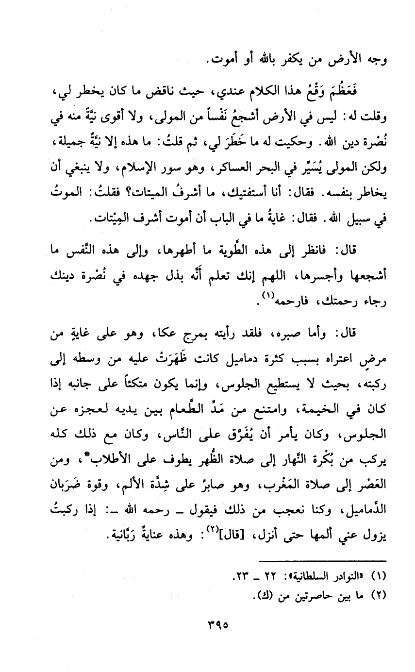 فَعظم وَقع هَذَا الْكَلَام عِنْدِي حَيْثُ نَاقض مَا كَانَ يخْطر لي وَقلت لَهُ لَيْسَ فِي الأَرْض أَشْجَع نفسا من الْمولى وَلَا أقوى نِيَّة مِنْهُ فِي نصْرَة دين الله وحكيت لَهُ مَا خطر لي ثمَّ قلت مَا هَذِه إِلَّا نِيَّة جميلَة وَلَكِن الْمولى يسير فِي الْبَحْر العساكر وَهُوَ سور الْإِسْلَام وَلَا يَنْبَغِي أَن يخاطر بِنَفسِهِ فَقَالَ أَنا أستفتيك مَا أشرف الميتات فَقلت الْمَوْت فِي سَبِيل الله فَقَالَ غَايَة مَا فِي الْبَاب أَن أَمُوت أشرف الميتات