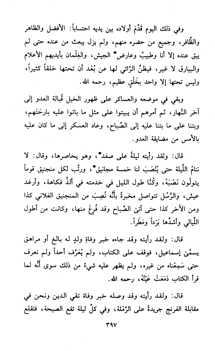 وَفِي ذَلِك الْيَوْم قدم أَوْلَاده بَين يَدَيْهِ احتسابا الْأَفْضَل وَالظَّاهِر والظافر وَجَمِيع من حَضَره مِنْهُم وَلم يزل يبْعَث من عِنْده حَتَّى لم يبْق عِنْده إِلَّا أَنا وطبيب وعارض الْجَيْش والغلمان بِأَيْدِيهِم الْأَعْلَام والبيارق لَا غير فيظن الرَّائِي لَهَا عَن بعد أَن تحتهَا خلقا كثيرا وَلَيْسَ تحتهَا إِلَّا وَاحِد بِخلق عَظِيم رَحمَه الله