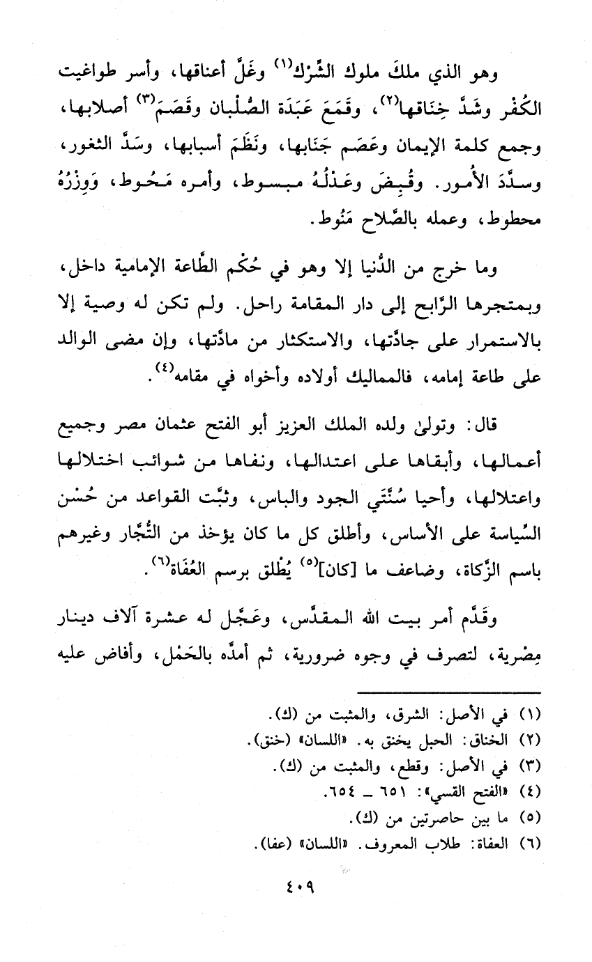 قَالَ وَتَوَلَّى وَلَده الْملك الْعَزِيز أَبُو الْفَتْح عُثْمَان مصر وَجَمِيع أَعمالهَا وأبقاها على اعتدالها ونفاها من شوائب اختلالها واعتلالها وَأَحْيَا سنتي الْجُود والباس وَثَبت الْقَوَاعِد من حسن السياسة على الأساس وَأطلق كل مَا كَانَ يُؤْخَذ من التُّجَّار وَغَيرهم باسم الزَّكَاة وضاعف مَا كَانَ يُطلق برسم العفاة