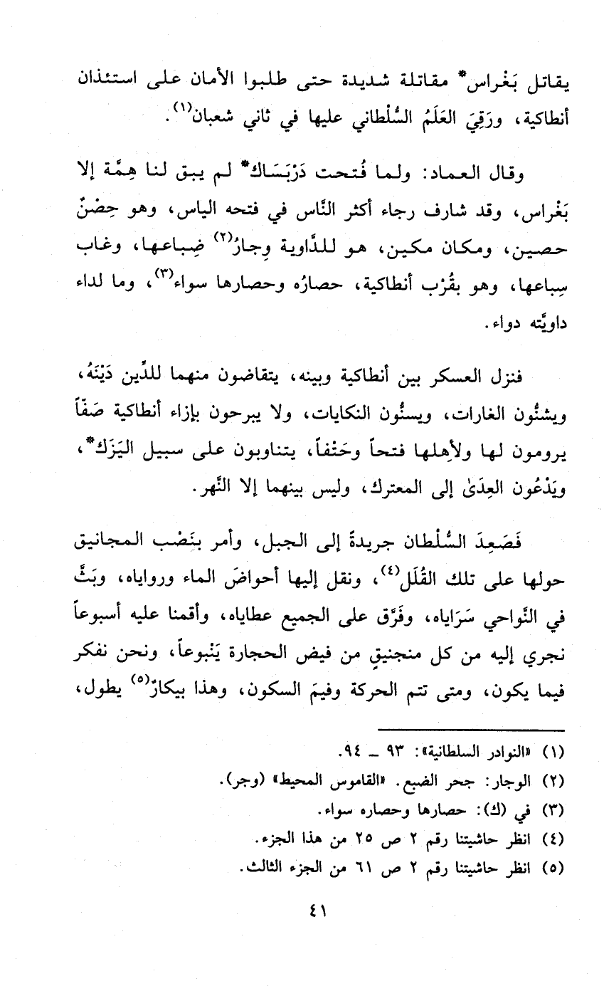 فَصَعدَ السُّلْطَان جَرِيدَة إِلَى الْجَبَل وَأمر بِنصب المجانيق حولهَا على تِلْكَ القلل وَنقل إِلَيْهَا أحواض المَاء ورواياه وَبث فِي النواحي سراياه وَفرق على الْجَمِيع عطاياه وأقمنا عَلَيْهِ أسبوعا نجري إِلَيْهِ من كل منجنيق من فيض الْحِجَارَة ينبوعا وَنحن نفكر فِيمَا يكون وَمَتى تتمّ الْحَرَكَة وفيم السّكُون وَهَذَا بيكار يطول