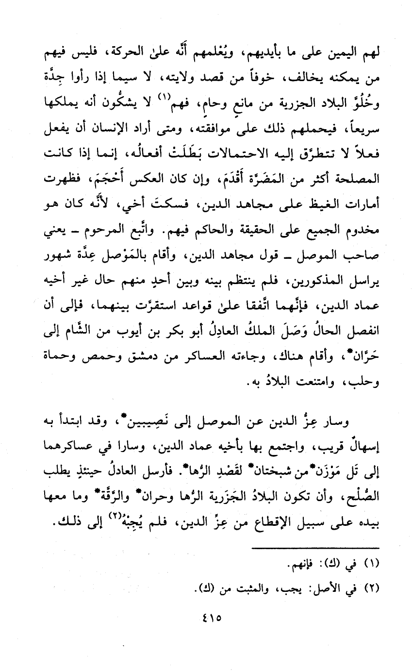 لَهُم الْيَمين على مَا بِأَيْدِيهِم وَيُعلمهُم أَنه على الْحَرَكَة فَلَيْسَ فيهم من يُمكنهُ يُخَالف خوفًا من قصد ولَايَته لَا سِيمَا إِذا رَأَوْا جدة وخلو الْبِلَاد الجزرية من مَانع وَحَام فهم لَا يَشكونَ أَنه يملكهَا سَرِيعا فيحملهم ذَلِك على مُوَافَقَته وَمَتى أَرَادَ الْإِنْسَان أَن يفعل فعلا لَا تتطرق إِلَيْهِ الِاحْتِمَالَات بطلت أَفعاله إِنَّمَا إِذا كَانَت الْمصلحَة أَكثر من الْمضرَّة أقدم وَإِن كَانَ الْعَكْس أحجم فظهرت أَمَارَات الغيظ على مُجَاهِد الدّين فَسكت أخي لِأَنَّهُ كَانَ هُوَ مخدوم الْجَمِيع على الْحَقِيقَة وَالْحَاكِم فيهم وَاتبع المرحوم يَعْنِي صَاحب الْموصل قَول مُجَاهِد الدّين وَأقَام بالموصل عدَّة شهور يراسل الْمَذْكُورين فَلم يَنْتَظِم بَينه وَبَين أحد مِنْهُم حَال غير أَخِيه عماد الدّين فَإِنَّهُمَا اتفقَا على قَوَاعِد اسْتَقَرَّتْ بَينهمَا فَإلَى أَن انْفَصل الْحَال وصل الْملك الْعَادِل أَبُو بكر بن أَيُّوب من الشَّام إِلَى حران وَأقَام هُنَاكَ وجاءته العساكر من دمشق وحمص وحماة وحلب وامتنعت الْبِلَاد بِهِ