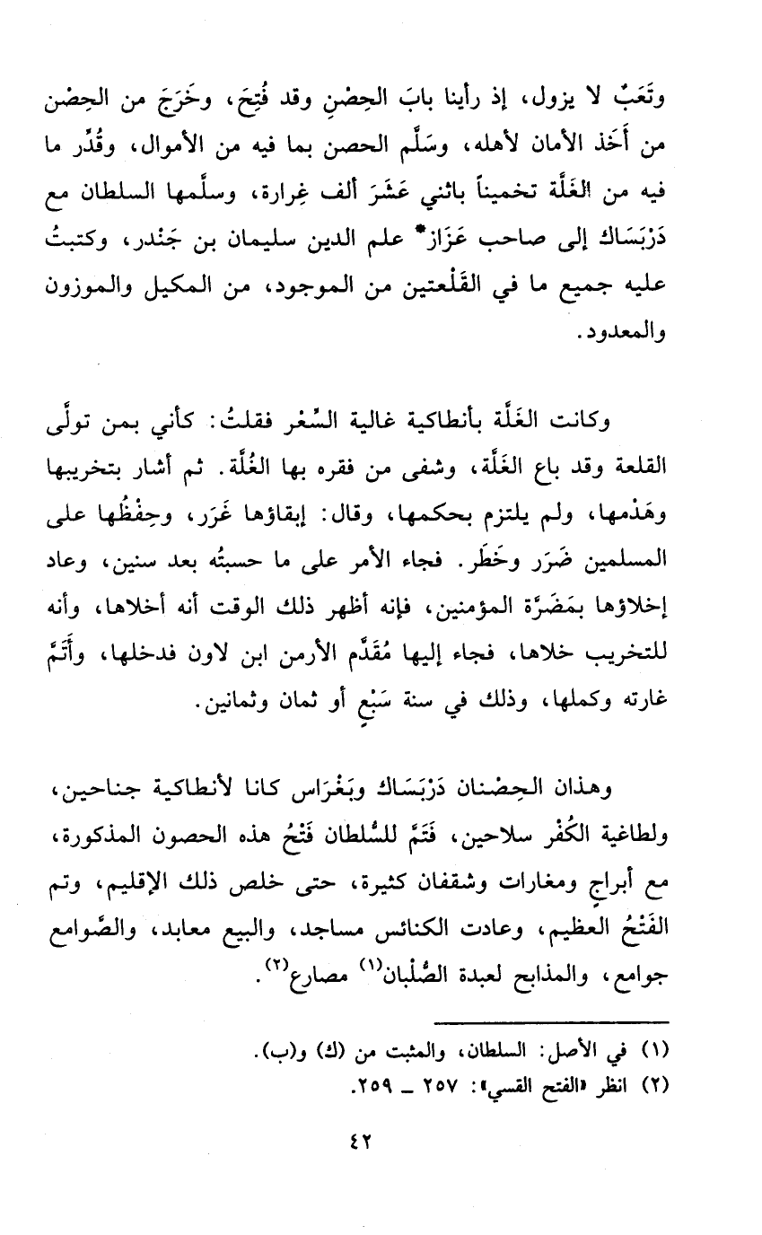 وَهَذَانِ الحصنان دربساك وبغراس كَانَا لأنطاكية جناحين ولطاغية الْكفْر سلاحين فتم للسُّلْطَان فتح هَذِه الْحُصُون الْمَذْكُورَة مَعَ أبراج ومغارات وشقفان كَثِيرَة حَتَّى خلص ذَلِك الاقليم وَتمّ الْفَتْح الْعَظِيم وعادت الْكَنَائِس مَسَاجِد وَالْبيع معابد والصوامع جَوَامِع والمذابح لعبدة الصلبان مصَارِع