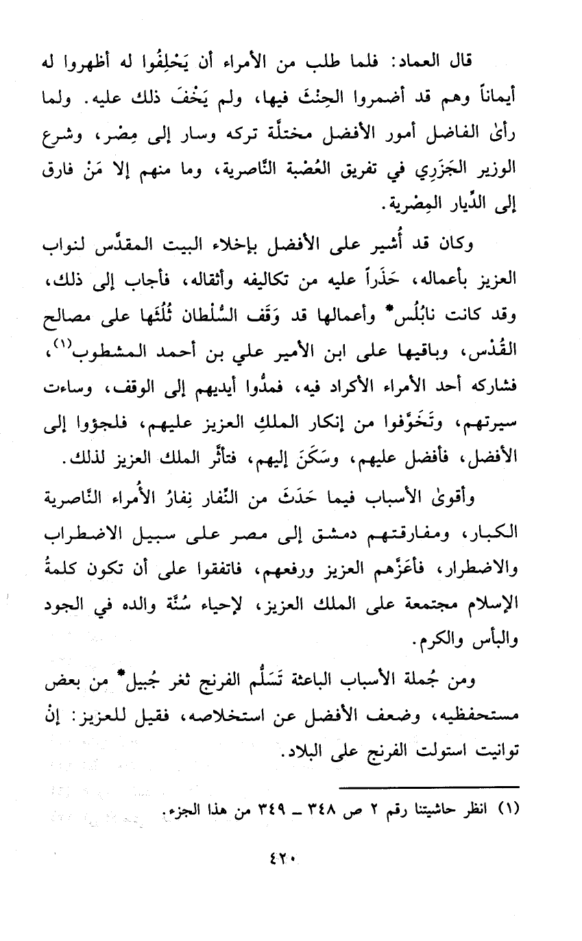 وَكَانَ قد أُشير على الْأَفْضَل باخلاء الْبَيْت الْمُقَدّس لنواب الْعَزِيز بِأَعْمَالِهِ حذرا عَلَيْهِ من تكاليفه وأثقاله فَأجَاب إِلَى ذَلِك وَقد كَانَت نابلس وأعمالها قد وقف السُّلْطَان ثلثهَا على مصَالح الْقُدس وباقيها على ابْن الْأَمِير عَليّ بن أَحْمد المشطوب فشاركه أحد الْأُمَرَاء الأكراد فِيهِ فمدوا أَيْديهم إِلَى الْوَقْف وَسَاءَتْ سيرتهم وتخوفوا من إِنْكَار الْملك الْعَزِيز عَلَيْهِم فلجؤوا إِلَى الْأَفْضَل فأفضل عَلَيْهِم وَسكن إِلَيْهِم فتأثر الْملك الْعَزِيز لذَلِك
