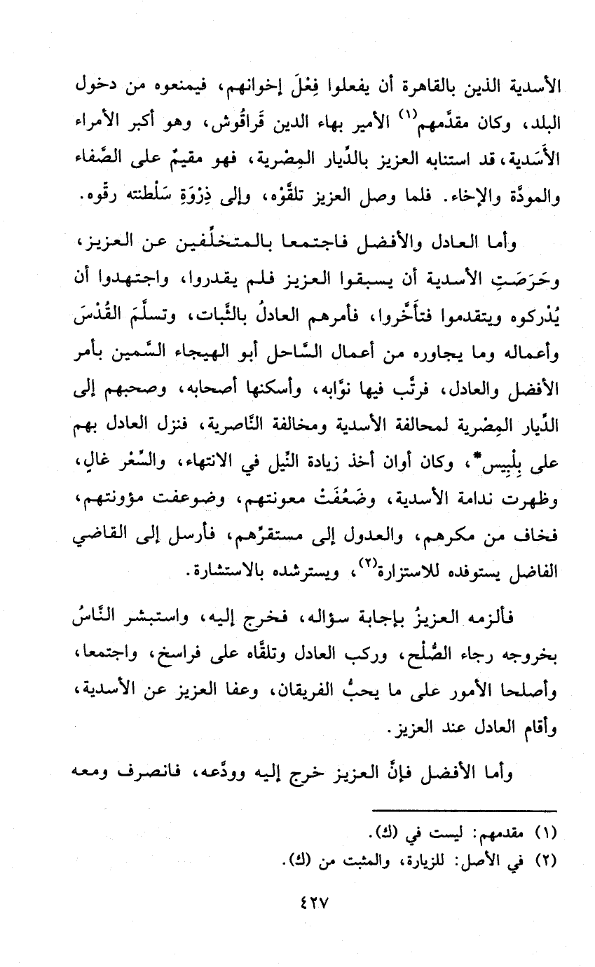 الأَسدِية الَّذين بِالْقَاهِرَةِ أَن يَفْعَلُوا فعل إخْوَانهمْ فيمنعوه من دُخُول الْبَلَد وَكَانَ مقدمهم الْأَمِير بهاء الدّين قراقوش وَهُوَ أكبر الْأُمَرَاء الأَسدِية قد استنابه الْعَزِيز بالديار المصرية فَهُوَ مُقيم على الصفاء والمودة وإلاخاء فَلَمَّا وصل الْعَزِيز تلقوهُ وَإِلَى ذرْوَة سلطنته رقوه