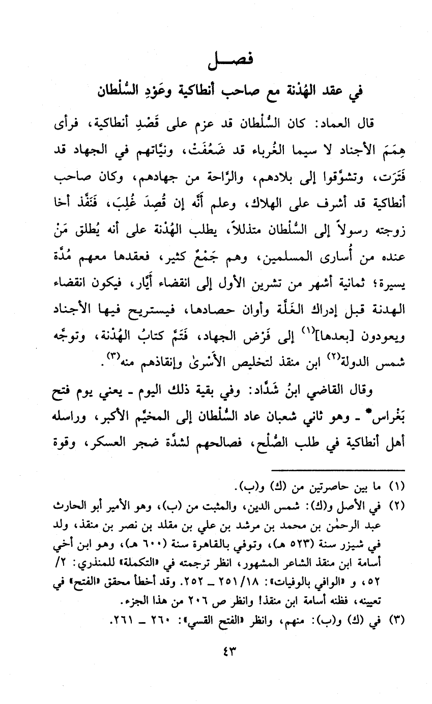 قَالَ الْعِمَاد كَانَ السُّلْطَان قد عزم على قصد أنطاكية فَرَأى همم الأجناد لَا سِيمَا الغرباء قد ضعفت ونياتهم فِي الْجِهَاد قد فترت وتشوقوا إِلَى بِلَادهمْ والراحة من جهادهم وَكَانَ صَاحب أنطاكية قد أشرف على الْهَلَاك وَعلم أَنه إِن قصد غلب فنفذ أَخا زَوجته رَسُولا إِلَى السُّلْطَان متذللا يطْلب الْهُدْنَة على أَنه يُطلق من عِنْده من أُسَارَى الْمُسلمين وهم جمع كثير فعقدها مَعَهم مُدَّة يسيرَة ثَمَانِيَة أشهر من تشرين الأول إِلَى انْقِضَاء أيار فَيكون انْقِضَاء الهدنه قبل إِدْرَاك الْغلَّة وَأَوَان حصادها فيستريح فِيهَا الأجناد ويعودون بعْدهَا إِلَى فرض الْجِهَاد فتم كتاب الهدنه وَتوجه شمس الدولة ابْن منقذ لتخليص الأسرى وإنقاذهم مِنْهُ