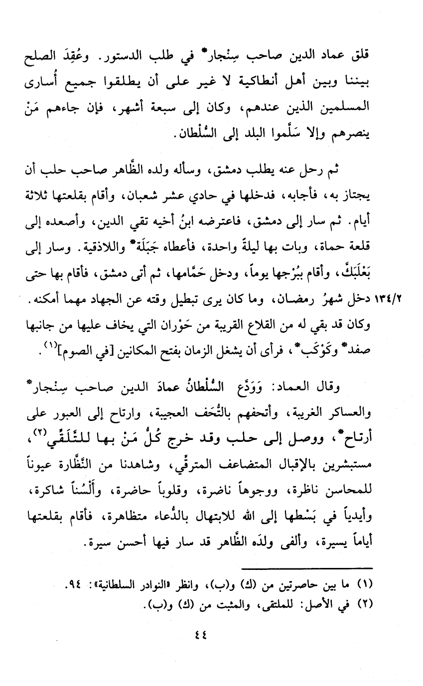 وَقَالَ الْعِمَاد وودع السُّلْطَان عماد الدّين صَاحب سنجار والعساكر الغريبة وأتحفهم بالتحف العجيبة وارتاح إِلَى العبور على أرتاح وَوصل إِلَى حلب وَقد خرج كل من بهَا للتلقي مستبشرين بالاقبال المتضاعف المترقي وشاهدنا من النظارة عيُونا للمحاسن ناظرة ووجوها ناضرة وَقُلُوبًا حَاضِرَة وألسنا شاكرة وأيديا فِي بسطها إِلَى الله للإبتهال بِالدُّعَاءِ متظاهرة فَأَقَامَ بقلعتها أَيَّامًا يسيرَة وألفى وَلَده الظَّاهِر قد سَار فِيهَا أحسن سيرة