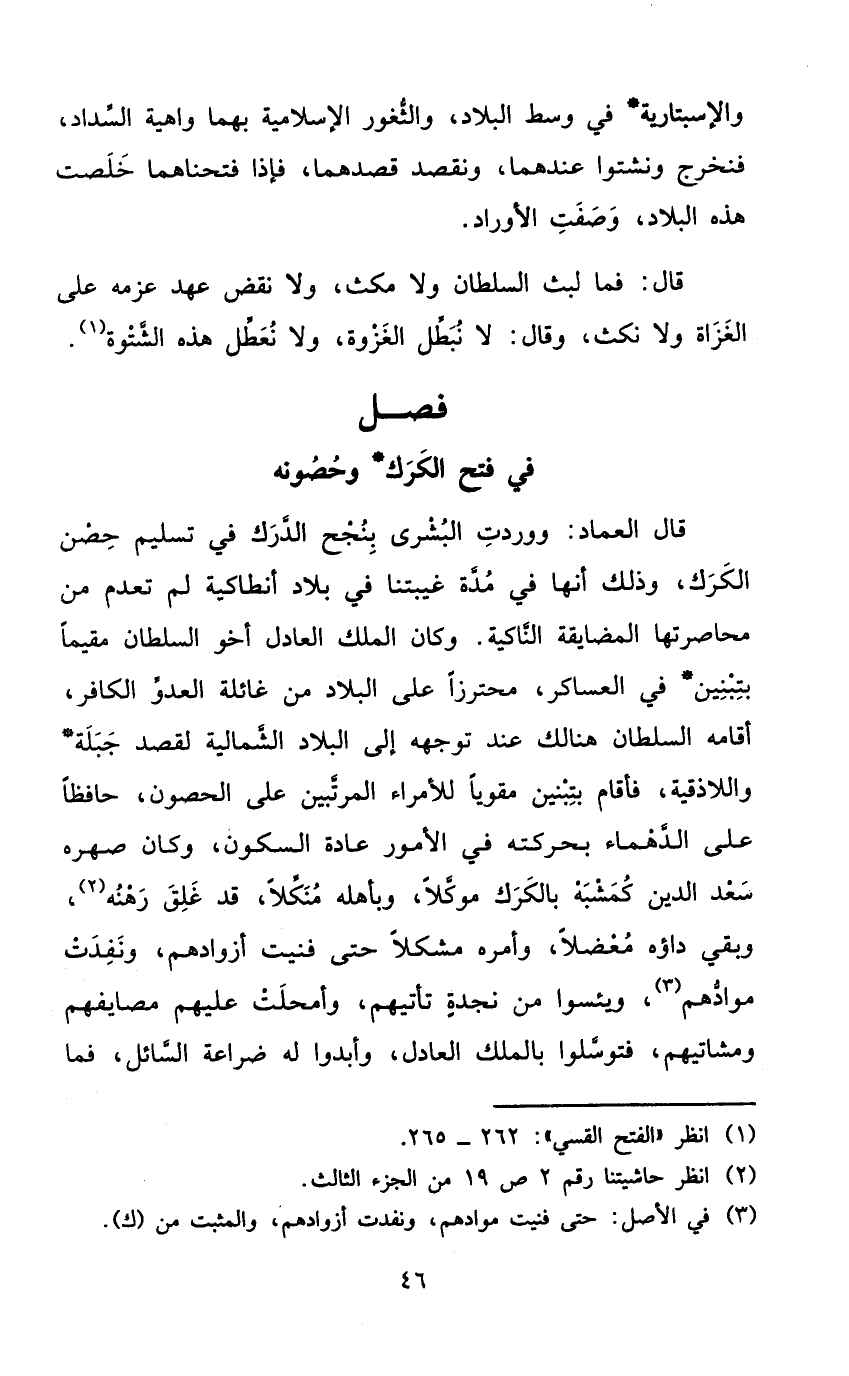 قَالَ الْعِمَاد ووردت الْبُشْرَى بنجح الدَّرك فِي تَسْلِيم حصن الكرك وَذَلِكَ أَنَّهَا فِي مُدَّة غيبتنا فِي بِلَاد أنطاكية لم تعدم من محاصرتها المضايقة الناكية وَكَانَ الْملك الْعَادِل أَخُو السُّلْطَان مُقيما بتبنين فِي العساكر محترزا على الْبِلَاد من غائلة الْعَدو الْكَافِر أَقَامَهُ السُّلْطَان هُنَالك عِنْد توجهه إِلَى الْبِلَاد الشمالية لقصد جبلة واللاذقية فَأَقَامَ بتبنين مقويا لِلْأُمَرَاءِ المرتبين على الْحُصُون حَافِظًا على الدهماء بحركته فِي الْأُمُور عَادَة السّكُون وَكَانَ صهره سعد الدّين كمشبة بالكرك موكلا وبأهله منكلا قد غلق رَهنه وَبَقِي داؤه معضلا وَأمره مُشكلا حَتَّى فنيت أَزْوَادهم ونفدت موادهم ويئسوا من نجدة تأتيهم وأمحلت عَلَيْهِم مصايفهم ومشاتيهم فتوسلوا بِالْملكِ الْعَادِل وأبدوا لَهُ ضراعة السَّائِل فَمَا