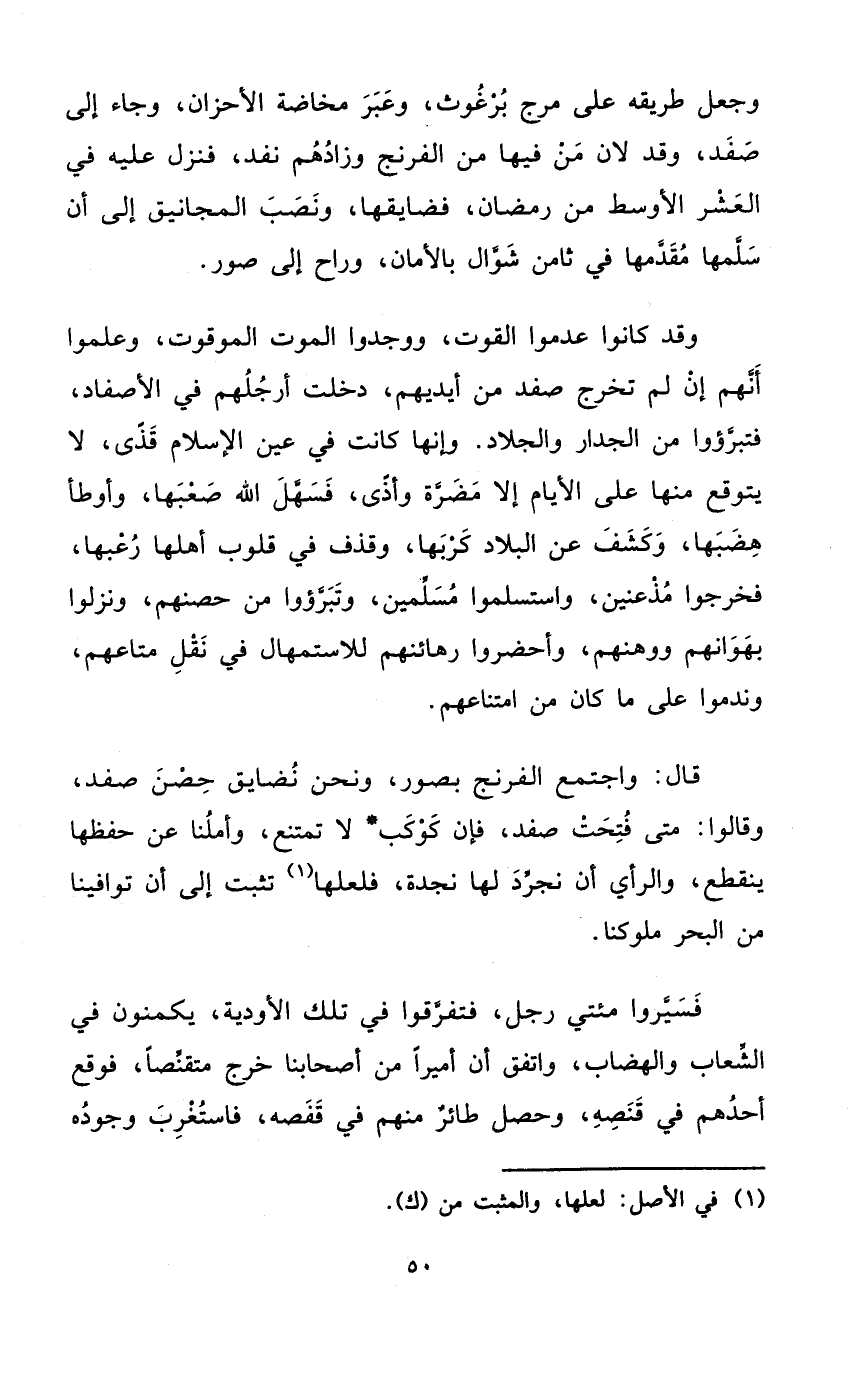 قَالَ وَاجْتمعَ الفرنج بصور وَنحن نضايق حصن صفد وَقَالُوا مَتى فتحت صفد فَإِن كَوْكَب لَا تمْتَنع وأملنا عَن حفظهَا يَنْقَطِع والرأي أَن نجرد لَهَا نجدة فلعلها تثبت إِلَى أَن توافينا من الْبَحْر مُلُوكنَا