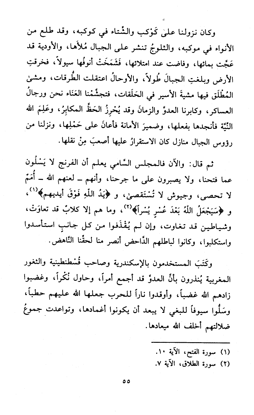 وَكَانَ نزولنا على كَوْكَب والشتاء فِي كوكبه وَقد طلع من الأنواء فِي موكبه والثلوج تنشر على الْجبَال ملأها والأودية قد عجت بِمَائِهَا وفاضت عِنْد امتلائها فشمخت أنوفها سيولا فخرقت الأَرْض وَبَلغت الْجبَال طولا والأوحال اعتقلت الطرقات وَمَشى الْمُطلق فِيهَا مشْيَة الْأَسير فِي الحلقات فتجشمنا العناء نَحن وَرِجَال العساكر وكابرنا الْعَدو وَالزَّمَان وَقد يحرز الْحَظ المكابر وَعلم الله النِّيَّة فأنجدها بِفِعْلِهَا وَضمير الْأَمَانَة فَأَعَانَ على حملهَا ونزلنا من رُؤُوس الْجبَال منَازِل كَانَ الِاسْتِقْرَار عَلَيْهَا أصعب من نقلهَا