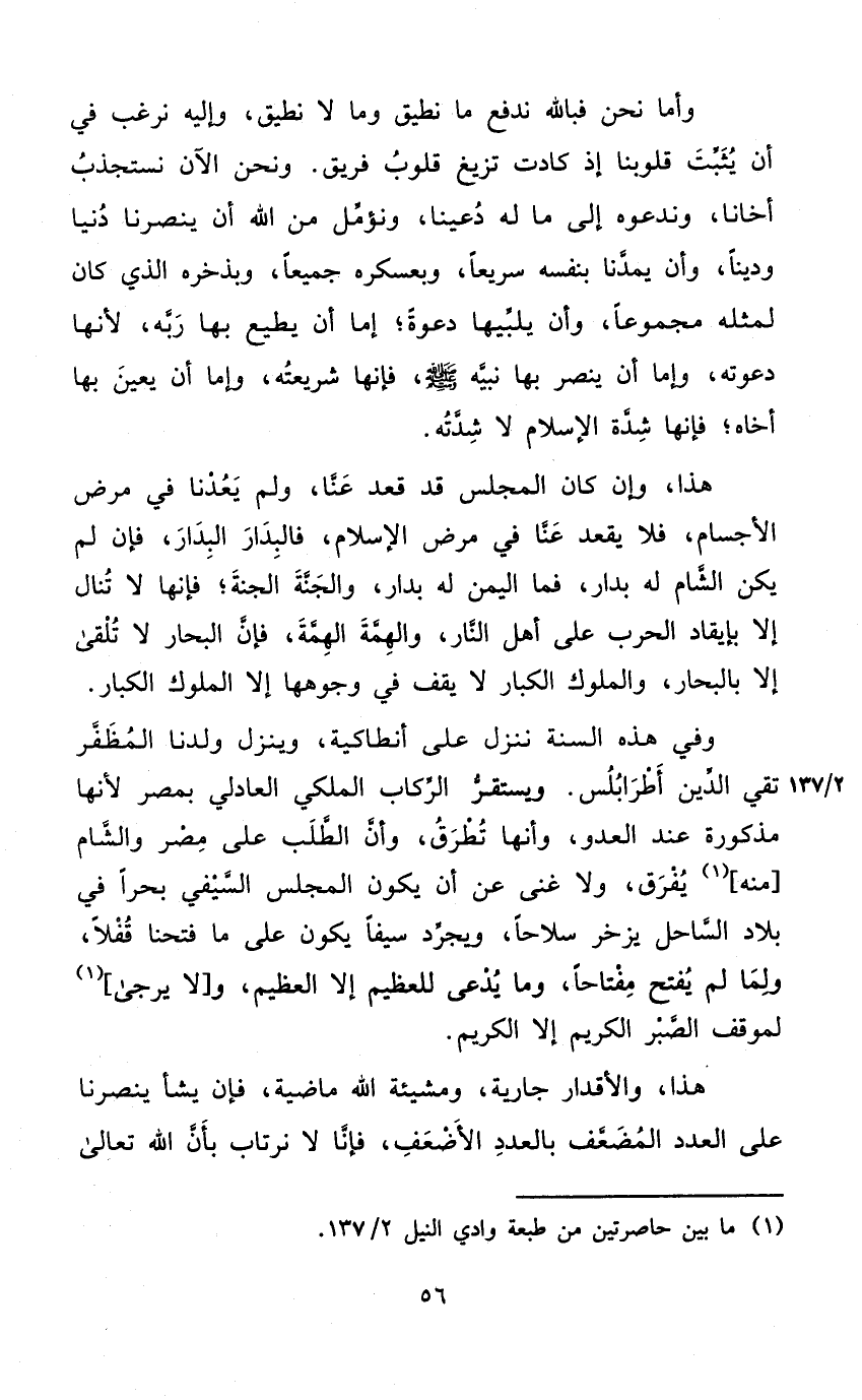 هَذَا وَإِن كَانَ الْمجْلس قد قعد عَنَّا وَلم يعدنا فِي مرض الْأَجْسَام فَلَا يقْعد عَنَّا فِي مرض الْإِسْلَام فالبدار البدار فَإِن لم يكن الشَّام لَهُ بدار فَمَا الْيمن لَهُ بدار وَالْجنَّة الْجنَّة فانها لَا تنَال إِلَّا بايقاد الْحَرْب على أهل النَّار والهمة الهمة فان الْبحار لَا تلقى إِلَّا بالبحار والملوك الْكِبَار لَا يقف فِي وجوهها إِلَّا الْمُلُوك الْكِبَار وَفِي هَذِه السّنة ننزل على أنطاكية وَينزل ولدنَا المظفر تَقِيّ الدّين أطرابلس ويستقر الركاب الملكي العادلي بِمصْر لِأَنَّهَا مَذْكُورَة عِنْد الْعَدو وَأَنَّهَا تطرق وَأَن الطّلب على مصر وَالشَّام مِنْهُ يفرق وَلَا غنى عَن أَن يكون الْمجْلس السيفي بحرا فِي بِلَاد السَّاحِل يزخر سِلَاحا ويجرد سَيْفا يكون على مَا فتحناه قفلا وَلما لم يفتح مفتاحا وَمَا يدعى للعظيم إِلَّا الْعَظِيم وَلَا يُرْجَى] لموقف الصَّبْر الْكَرِيم إِلَّا الْكَرِيم