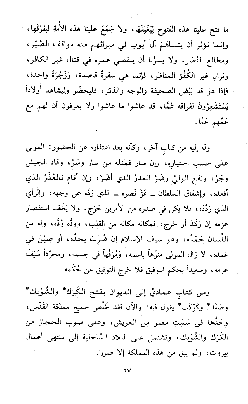وَمن كتاب عمادي إِلَى الدِّيوَان بِفَتْح الكرك والشوبك وصفد وكوكب يَقُول فِيهِ والآن فقد خلص جَمِيع مملكة الْقُدس وَحدهَا فِي سمت مصر من الْعَريش وعَلى صوب الْحجاز من الكرك والشوبك وتشتمل على الْبِلَاد الساحلية إِلَى مُنْتَهى أَعمال بيروت وَلم يبْق من هَذِه المملكة إِلَّا صور