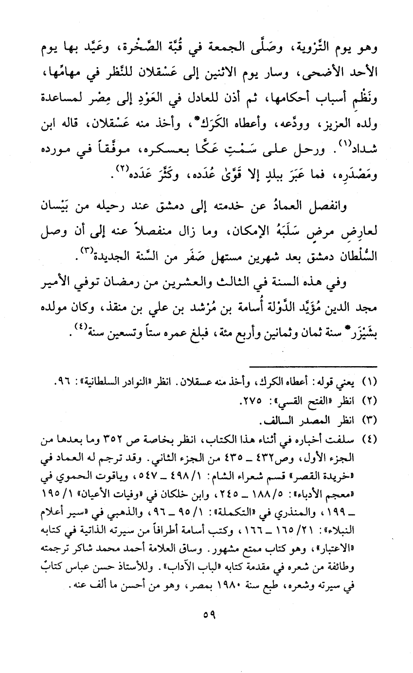 وانفصل الْعِمَاد عَن خدمته إِلَى دمشق عِنْد رحيله من بيسان لعَارض مرض سلبه الامكان وَمَا زَالَ مُنْفَصِلا عَنهُ إِلَى أَن وصل السُّلْطَان دمشق بعد شَهْرَيْن مستهل صفر من السّنة الجديدة