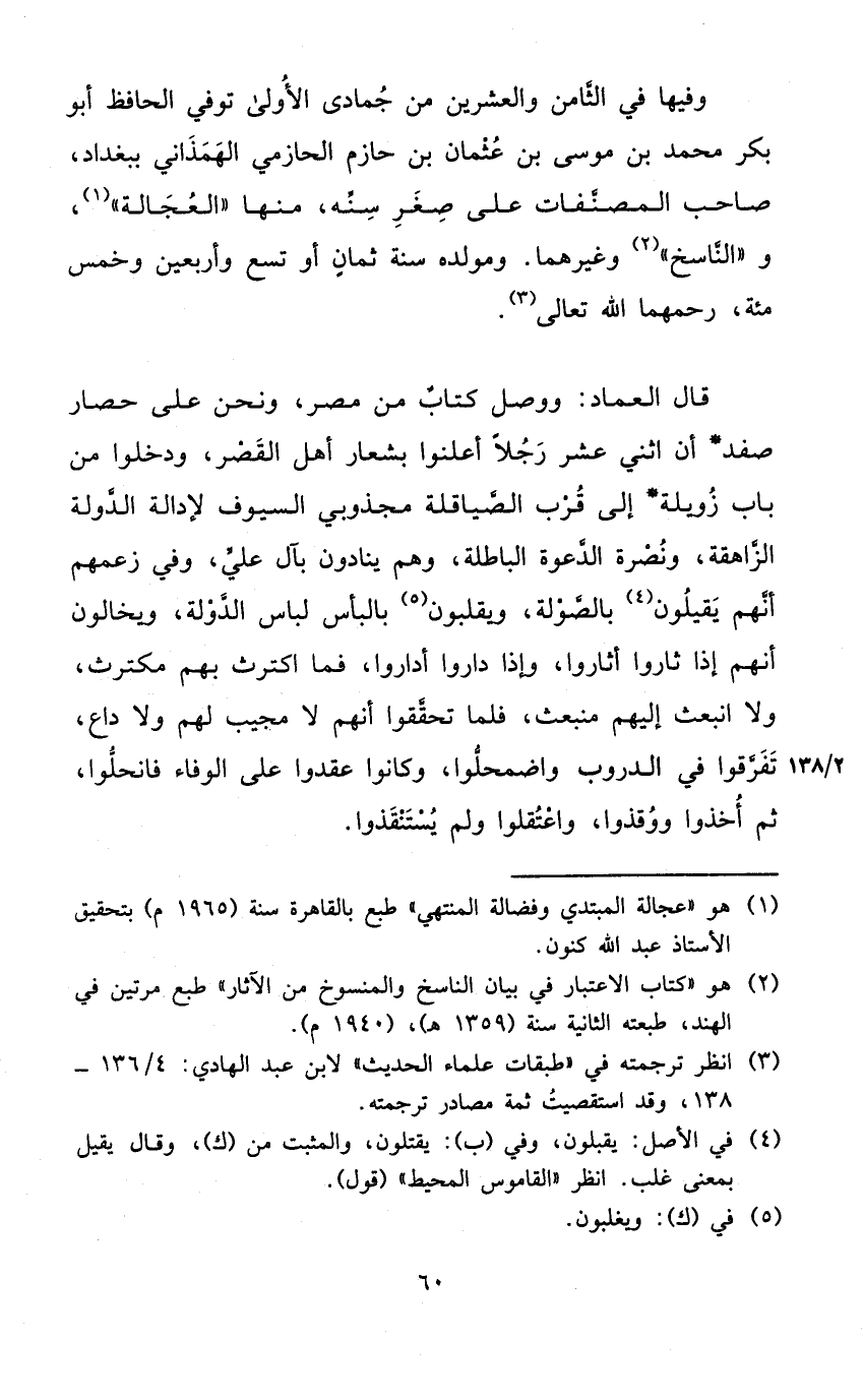 وفيهَا فِي الثَّامِن وَالْعِشْرين من جُمَادَى الأولى توفّي الْحَافِظ أَبُو بكر مُحَمَّد بن مُوسَى بن عُثْمَان بن حَازِم الْحَازِمِي الهمذاني بِبَغْدَاد صَاحب المصنفات على صغر سنه مِنْهَا العجالة والناسخ وَغَيرهمَا ومولده سنة ثَمَان أَو تسع وَأَرْبَعين وَخمْس مئة رحمهمَا الله تَعَالَى
