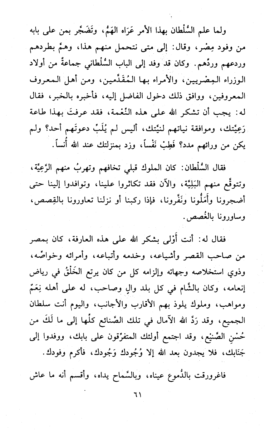 فَقَالَ السُّلْطَان كَانَ الْمُلُوك قبلي تخافهم وتهرب مِنْهُم الرّعية وتتوقع مِنْهُم البلية والآن فقد تكاثروا علينا وتوافدوا إِلَيْنَا حَتَّى أضجرونا وأملونا ونفرونا فَإِذا ركبنَا أَو نزلنَا تعاورونا بالقصص وساورونا بالغصص