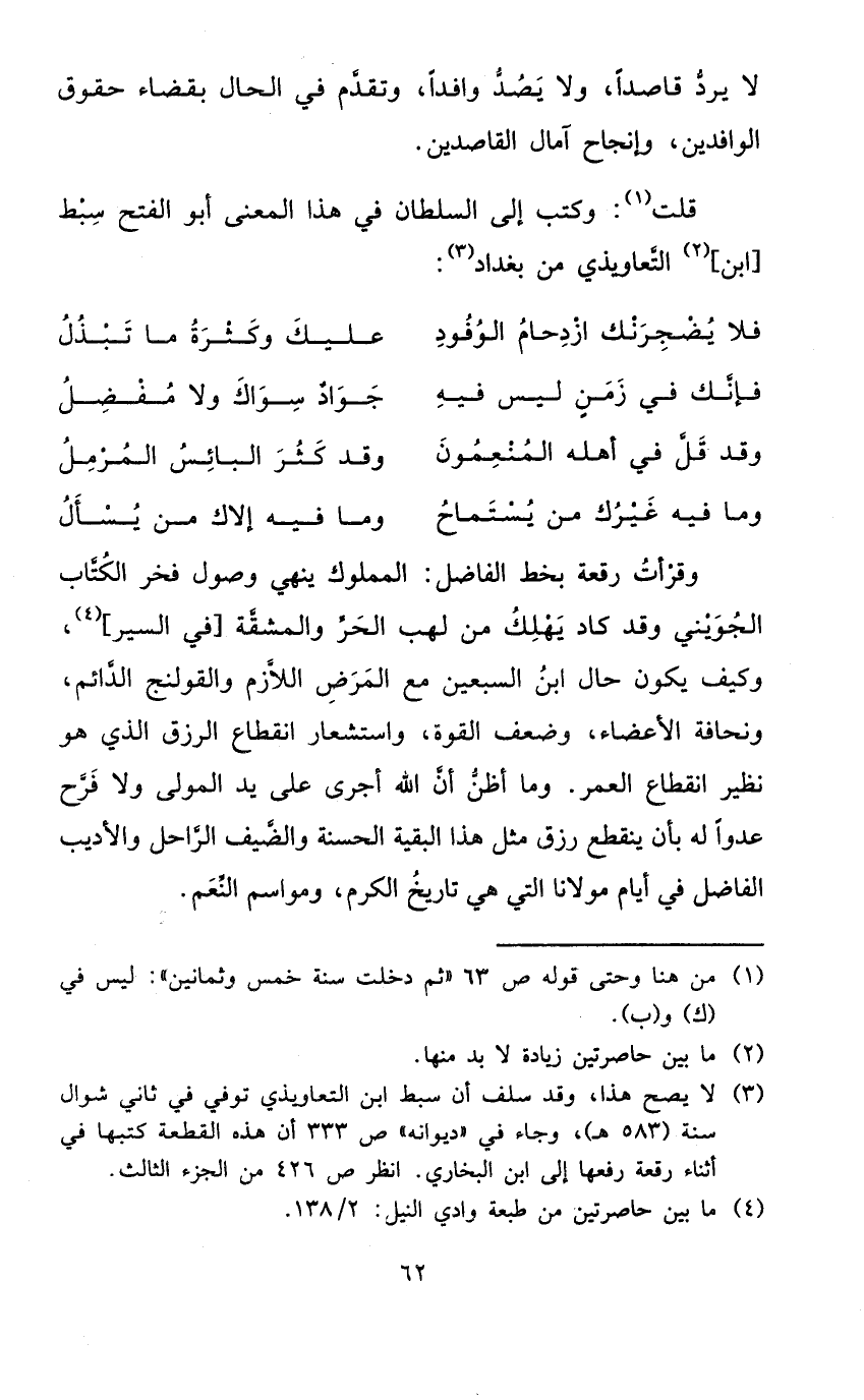 وقرأت رقْعَة بِخَط الْفَاضِل الْمَمْلُوك يُنْهِي وُصُول فَخر الْكتاب الْجُوَيْنِيّ وَقد كَاد يهْلك من لَهب الْحر وَالْمَشَقَّة فِي السّير وَكَيف يكون حَال ابْن السّبْعين مَعَ الْمَرَض اللَّازِم والقولنج الدَّائِم ونحافة الاعضاء وَضعف الْقُوَّة واستشعار انْقِطَاع الرزق الَّذِي هُوَ نَظِير انْقِطَاع الْعُمر وَمَا أَظن أَن الله أجْرى على يَد الْمولى وَلَا فَرح عدوا لَهُ بِأَن يَنْقَطِع رزق مثل هَذَا الْبَقِيَّة الْحَسَنَة والضيف الراحل والأديب الْفَاضِل فِي أَيَّام مَوْلَانَا الَّتِي هِيَ تَارِيخ الْكَرم ومواسم النعم